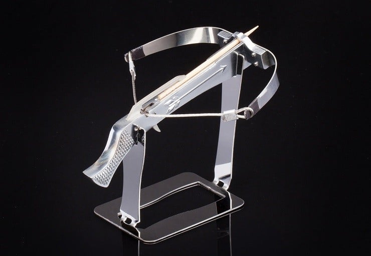 In America, toothpick crossbows have become the weapon of choice for intra-office competitions and pecking order solutions. Due to the potential danger posed by misuse of this aggressive toy when used with unauthorized ammunition, the Bowman Mini Crossbow ($25) from Uncommon Carry has had its range and power reduced to an effective distance of between 15 and 30-foot accuracy. Made of stainless steel with a spring steel bow, this 5″ long bow has a sleek design and simple trigger mechanism. The forward guide not only helps stabilize the bolt’s flight, the top is the front post of a simple open sight. Since the Bowman Mini Crossbow is meant to help establish the social order, it is available in black, silver, or an elegant gold finish.