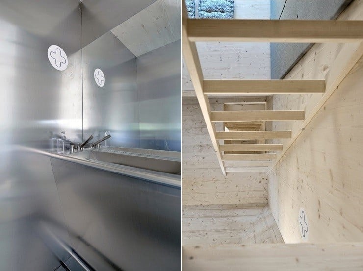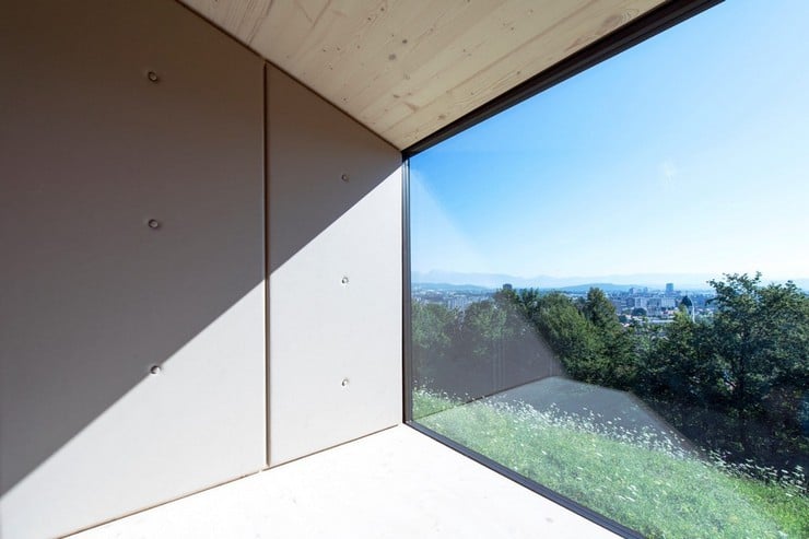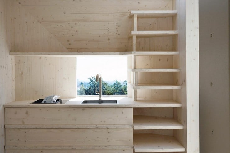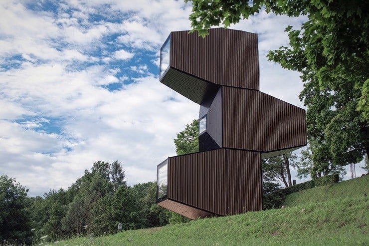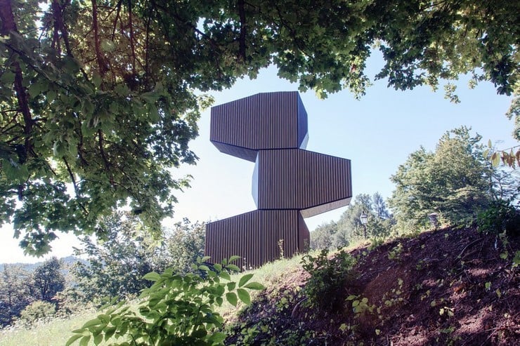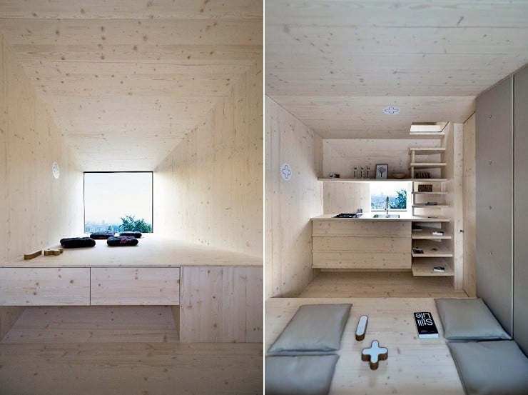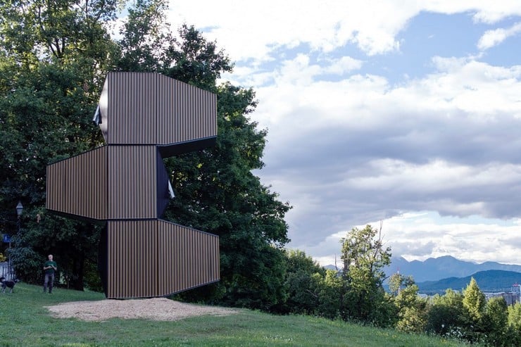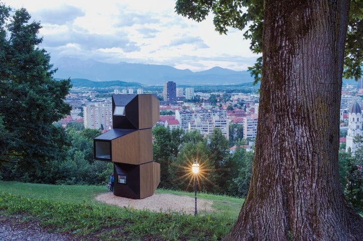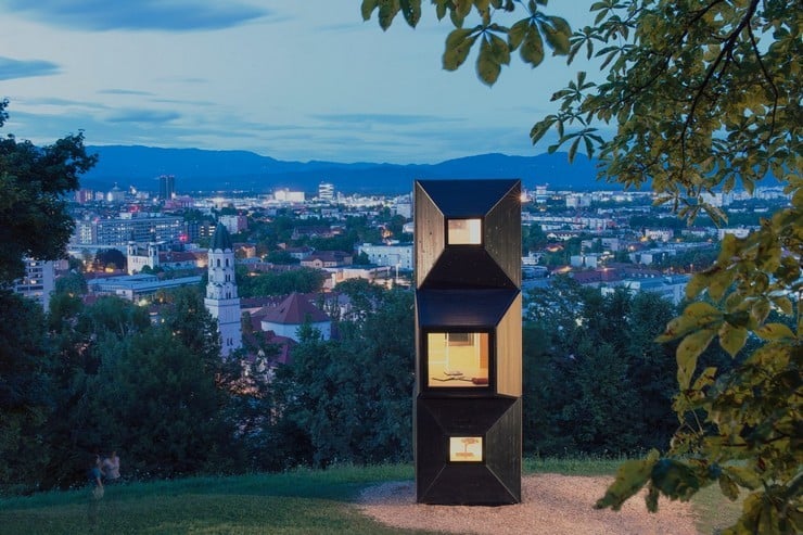 Shown here is OFIS Architects three unit tall Living Unit on the grounds of Ljubljana Castle, in Slovenia. Instead of a kitchen and dining area at ground level with a second-floor bedroom and third-floor lounge, this micro-dwelling houses a select library for the Castle guests to explore.