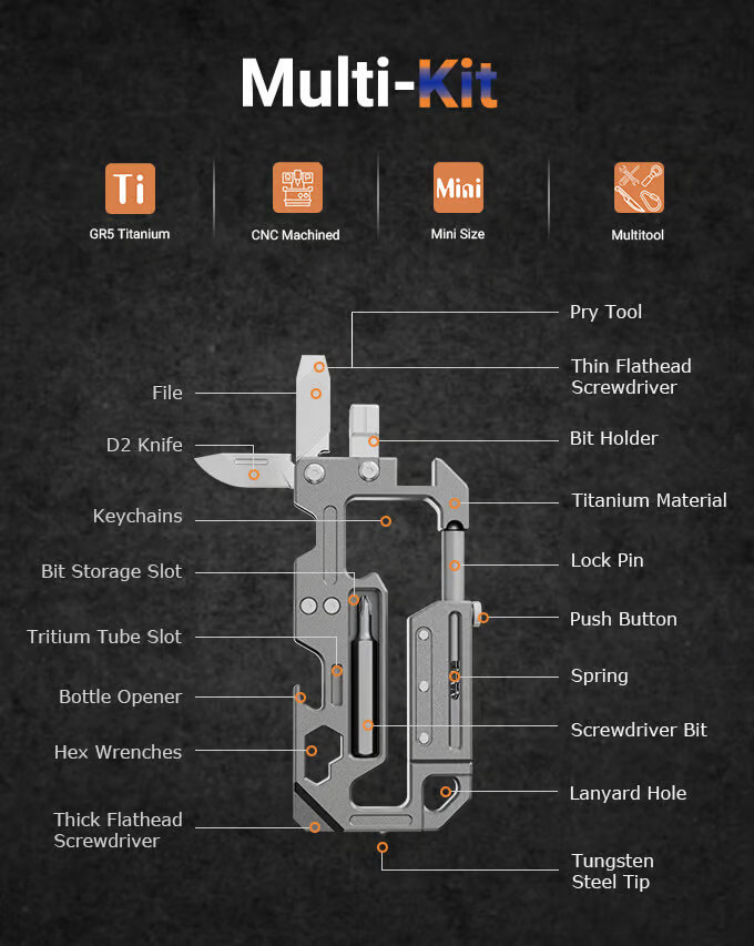 When in the dark, tritium gas tube slots make EckDesign’s Multi-Kit easy to spot. Moreover, its Gr5 titanium construction in stone washed finish makes it incredibly lightweight yet strong, rustproof, and corrosion resistant. It’s a versatile multi-tool that’s crafted for ergonomic comfort and strength. It’s as effortless to carry as it is to use, offering a lanyard hole or carabiner style carry.