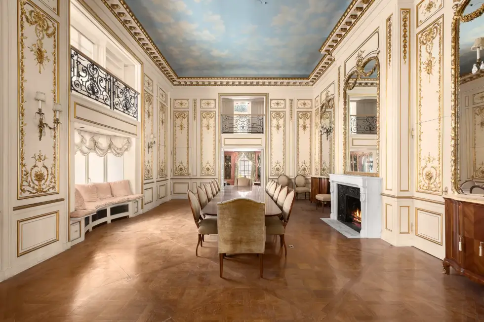 Meanwhile, the lower level of this Manhattan spread hosts a separate two-bedroom, two-bath guest wing which has its own kitchen, fireside, and living room. Then the modern interiors boast crystal chandeliers, Parquet de Versailles floors, ornate moldings, and 23-foot ceilings. The formal dining room even boasts 18th-century-inspired French panels. A private elevator opens to a double-height entrance gallery that flows to a large Louis XIV-inspired ballroom featuring expansive glazing.