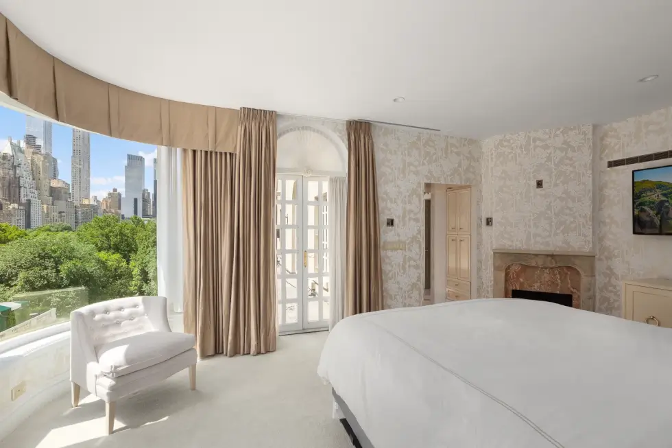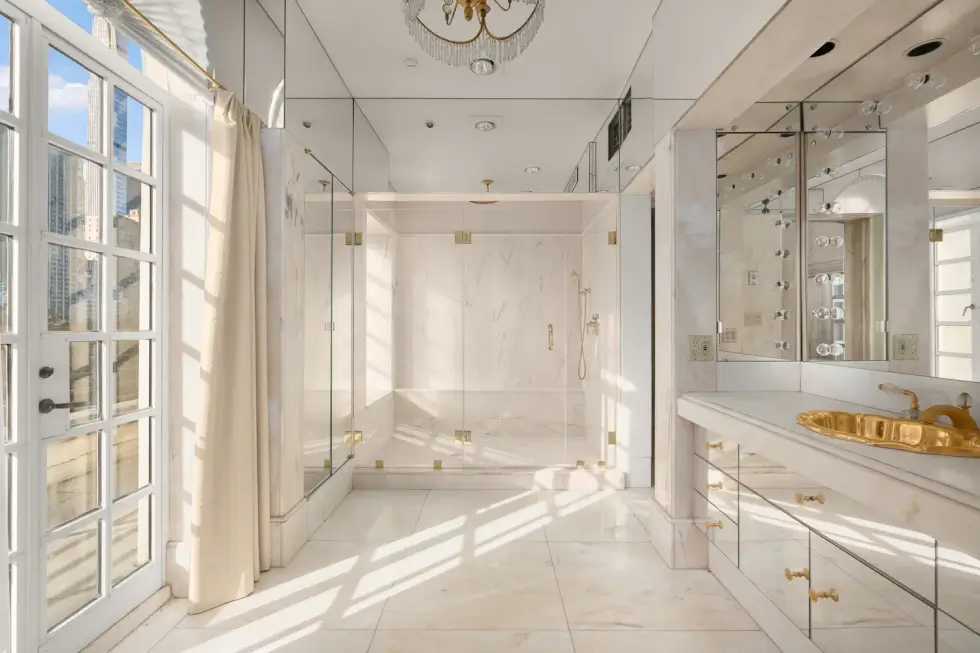 The French Neoclassical-style Manhattan triplex sits on the top three floors of the condominium and boasts nearly 4,700 square feet of space. Five bedrooms, six baths, and five wood-burning fireplaces spread across the property. There’s also a wood-clad library/media room. The upstairs primary suite has a corner office and luxurious bath with dual vanities and a glass-encased shower.