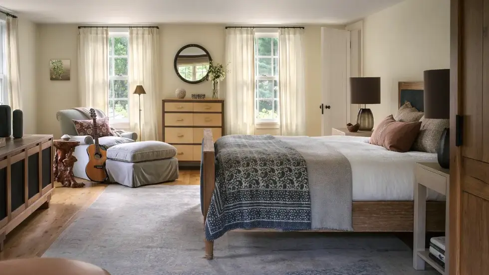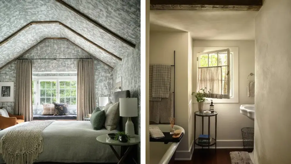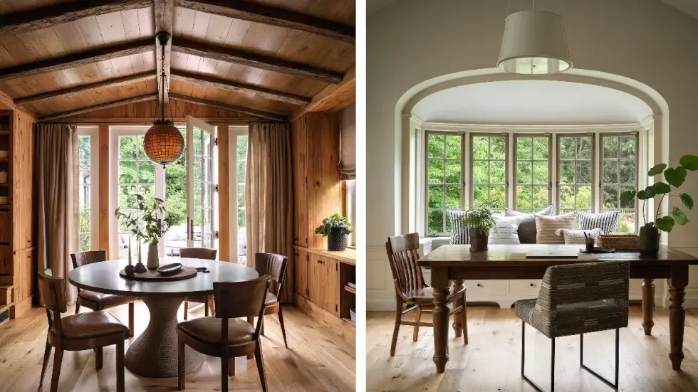 The 6,389-square-foot farmhouse at 101&103 Old Mill Road boasts five bedrooms, two mudrooms, family room, a living room, study, dining room, and a separate bar room. It also has a spacious kitchen, breakfast room, and a cozy dining nook. There are four more bedrooms upstairs, some with vaulted ceilings and elegant wall coverings, while others are more traditional with large windows and plaster walls. The home features several original details including wood ceiling beams in the bathrooms and wood floors throughout.