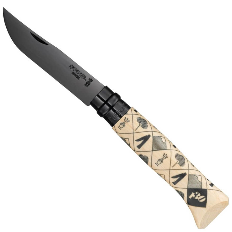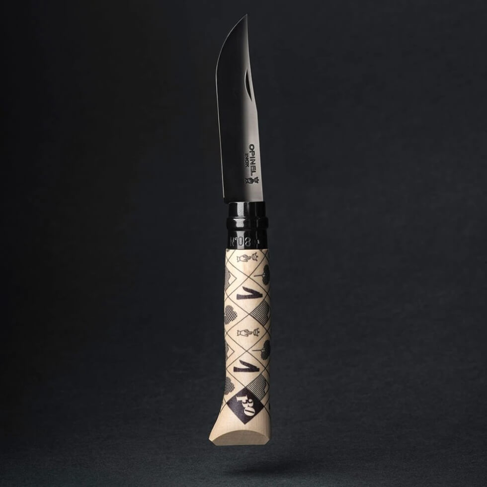 The handle of the knife is made from French Hornbeam and designed with a graphical checkerboard. The icons on the checkerboard represent the brand’s region and allude to Opinel’s workshop at the foot of the French Alps.