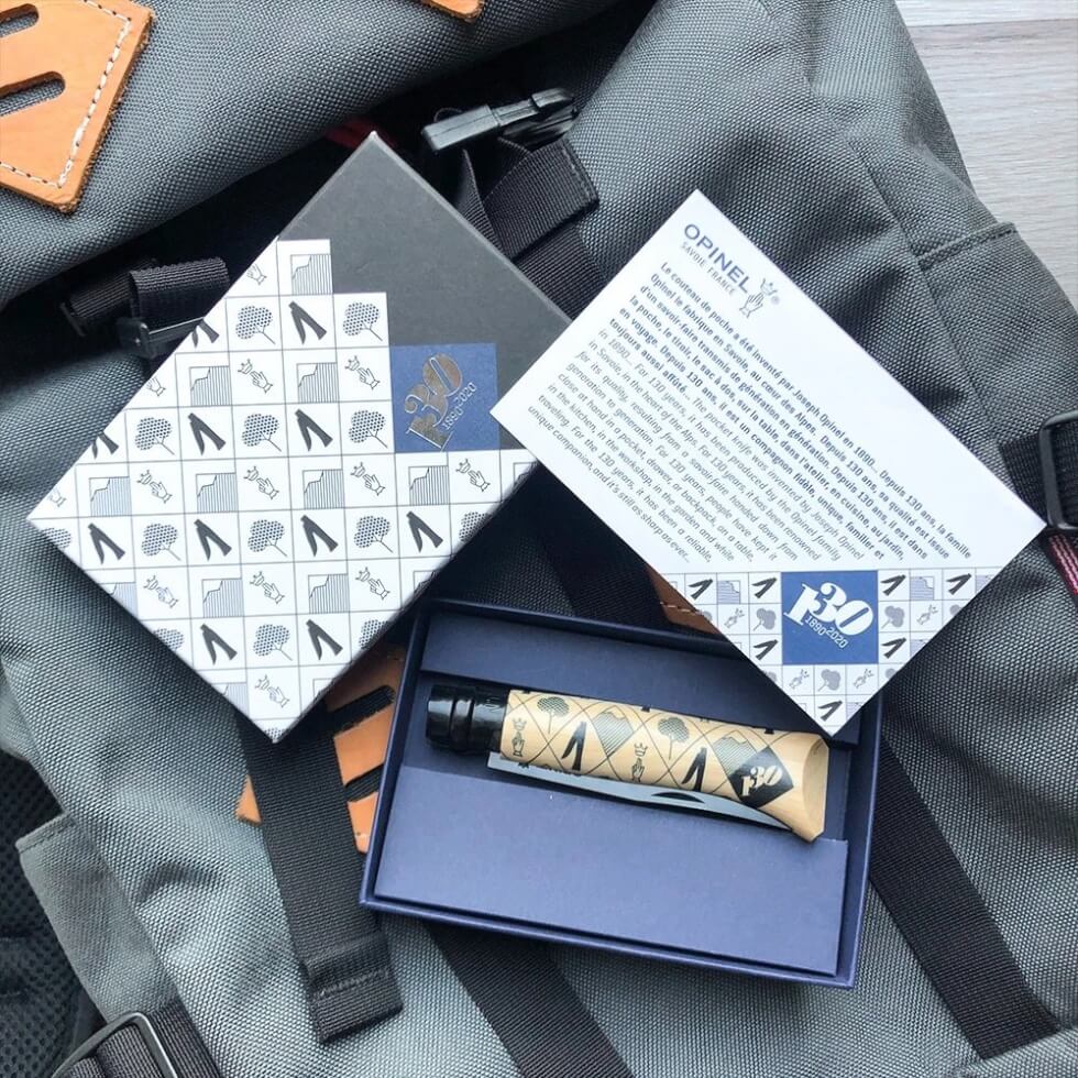 The Opinel 130th Anniversary No. 08 Folding knife comes in a box and with a brochure telling the history of how Joseph Opinel turned a simple folding knife into a timeless and heirloom piece .