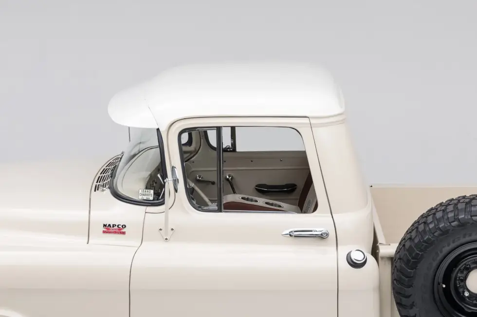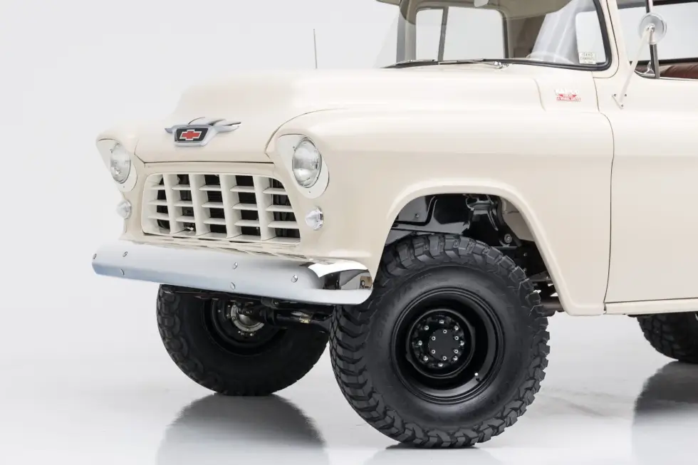 Bring A Trailer likewise notes that its Napco 4×4 setup powers all four wheels via a dual-range transfer case. Speaking of which, this 1955 Chevrolet 3200 is outfitted with 16” Vintique rims shod in 305/70 BFGoodrich Mud-Terrain T/A rubber. It recently received some modifications such as the soft ride springs and a lift kit.