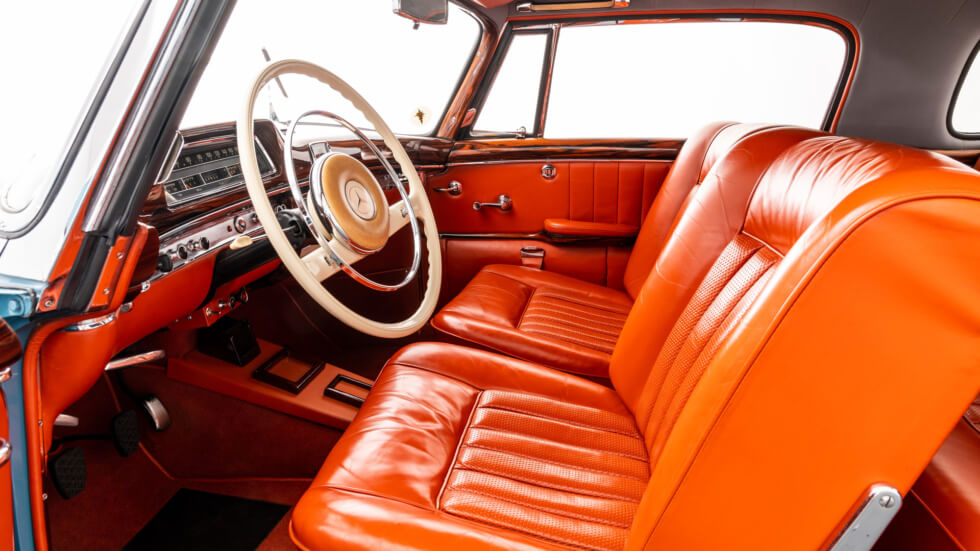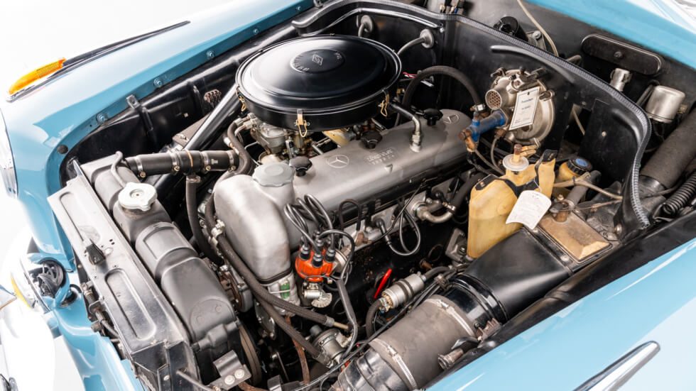 Its cockpit features a 2+3 seating arrangement with rich brown leather upholstery and silver trims. There’s also a sunroof, which is rare to find on the 1960 Mercedes-Benz 220 SE Ponton. Under the hood is a 105-horsepower inline-six engine and a four-speed manual transmission.