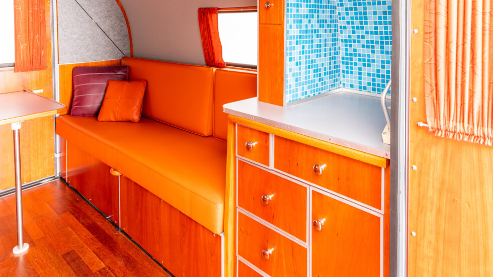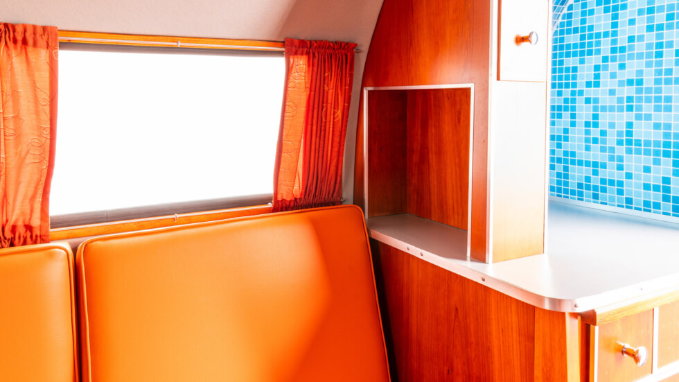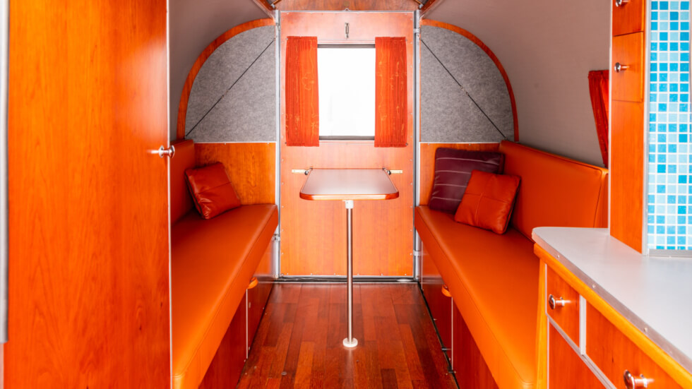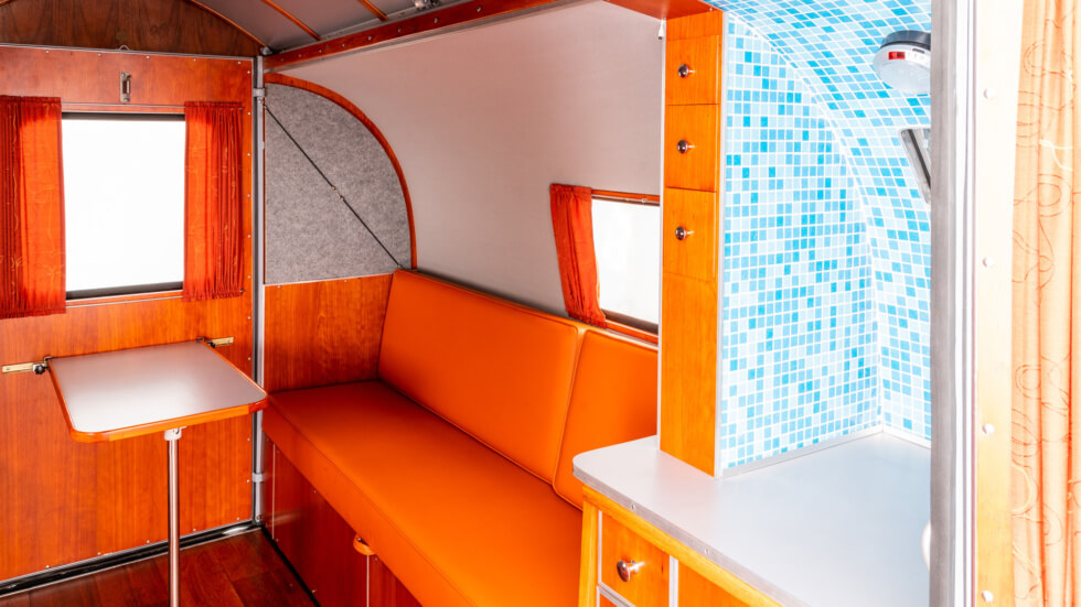 Inside, you’ll find seats in the same shade of brown leather upholstery as the car’s interior, a bed, a table, shelves, windows with curtains, a steel sliding roof, and more. Mechatronik is listing the 1960 Mercedes-Benz 220 SE Ponton for approximately $132,700 including a matching awning.