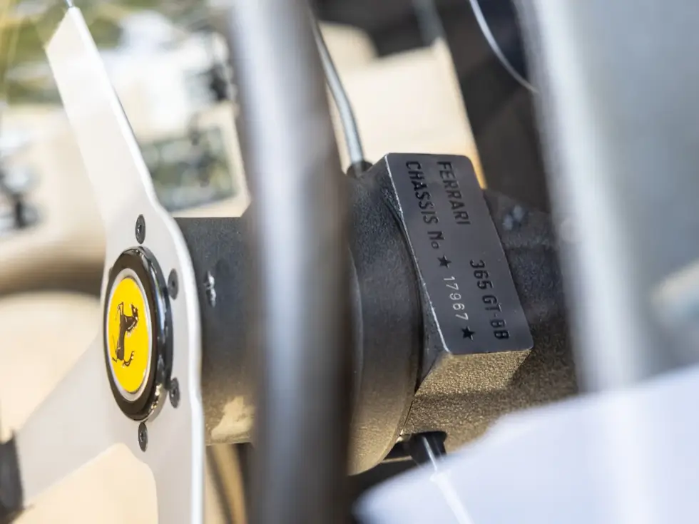 Inspection shows chassis number 17967 with engine number 00107 and gearbox number 487. Documentation indicates the 1974 365 GT4 BB rolled out of the assembly line in Rosso Chiaro with a Pelle Blu interior. In addition to its Ferrari Classiche certification, the sale includes the “Red Book.”