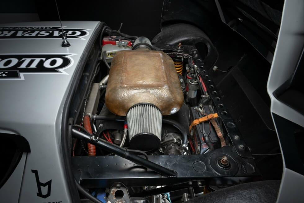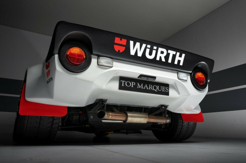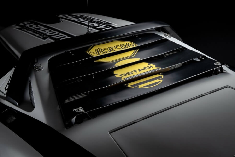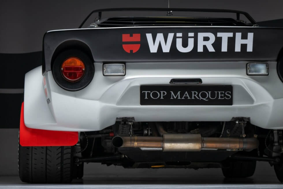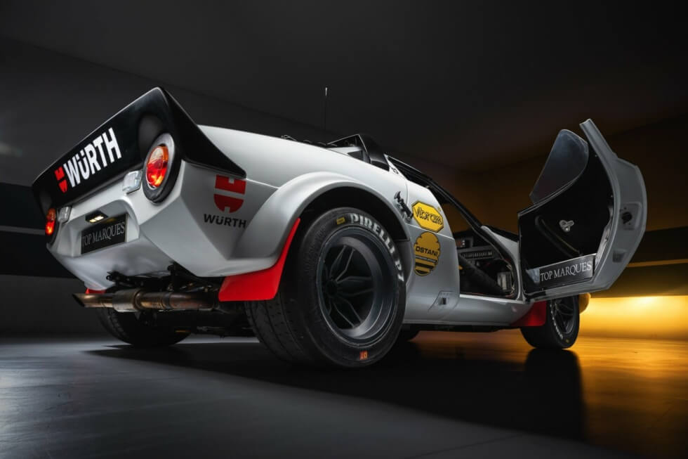 Furthermore, its restoration process meticulously matches the original Group 4 rally specifications. This 1974 Lancia Stratos is an actual competition car and even includes FIA papers. The exterior flaunts a gray paint job with white squares on the two doors and racing livery all around.