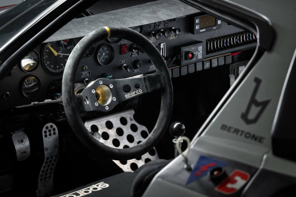 The front of the 1974 Lancia Stratos packs four light pods with removable covers. Meanwhile, the interior showcases classic instruments, switches, Sparco racing seats, and more. Its wheels are shod in period-accurate Pirelli P7 tires. It’s in excellent running condition and can even join a special competition or two.