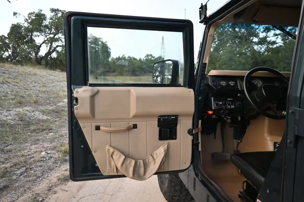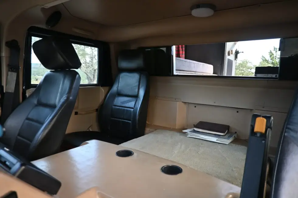 Powering its electronics is a Goal Zero Yeto 3000 lithium portable power station. The camper also features plenty of storage options. Owners can access the living spaces via the rear door or through a window from the front. The 1994 AM General Hummer H1 camper conversion rides on a set of 17” black alloy wheels shod in 40” x 13.50” Pro Comp Xtreme MT2 tires.