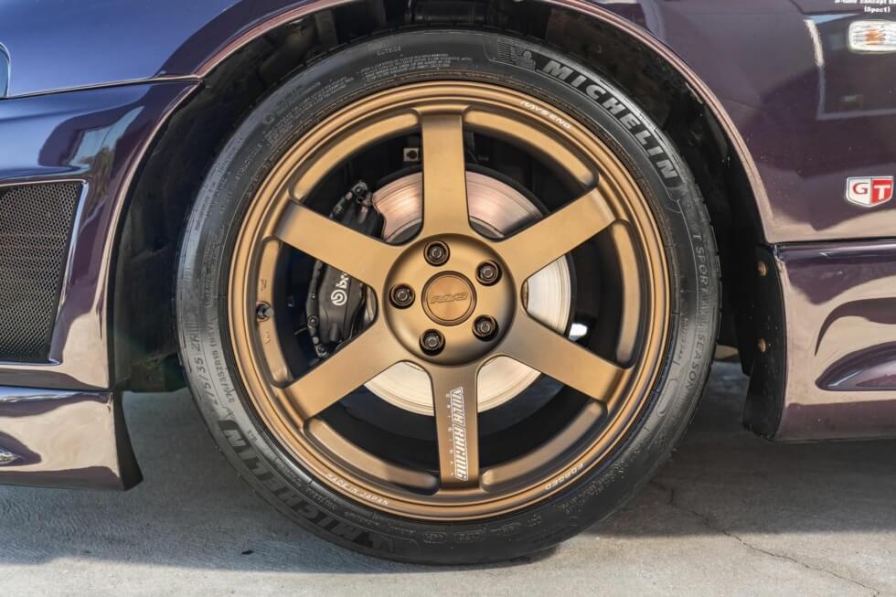 Under the hood is a 2.6-liter twin-turbo inline-six engine. It cranks out around 276 horsepower and 271 lb-ft of torque. The potent mill is mated to a five-speed manual gearbox that sends everything to all four wheels. Speaking of which, this sleek coupe is sitting on a set of 18″ Rays Engineering Volk Racing TE37 rims.