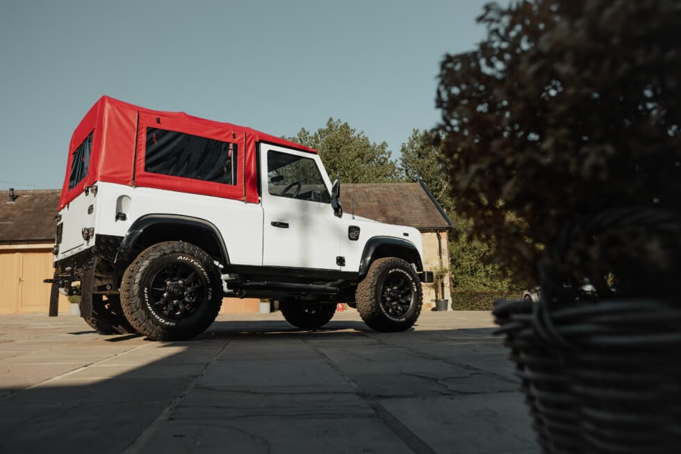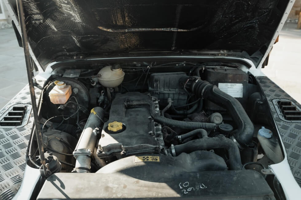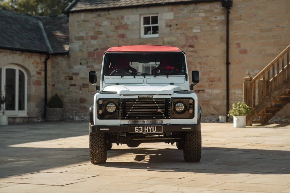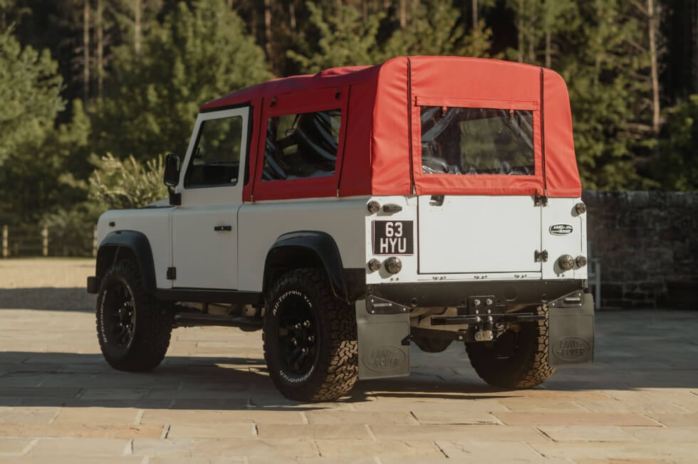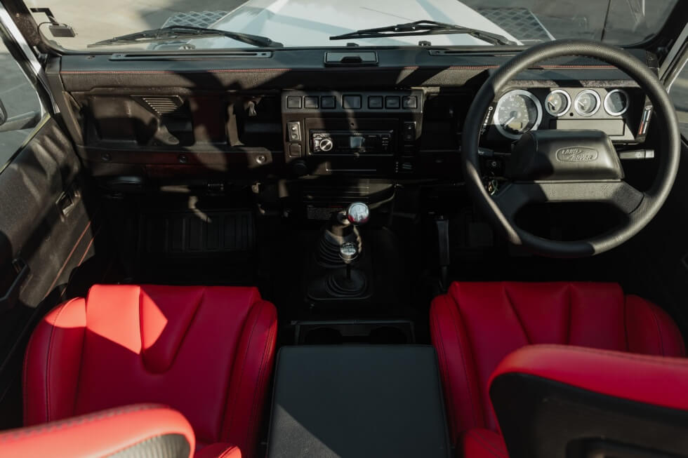 Rear seats mean you and the gang can head out on escapades. The 1999 Land Rover Defender 90 is finished in white with black trims on the flared fenders, grille, bumpers, running boards, door handles, and hinges. The removable soft top is red. It’s in a right-hand-drive setup with a 2.5 TD5 engine and a manual gearbox.