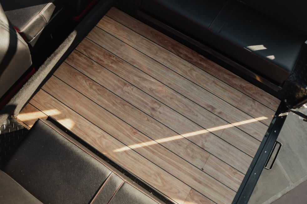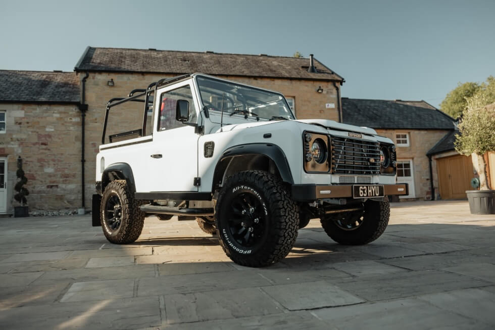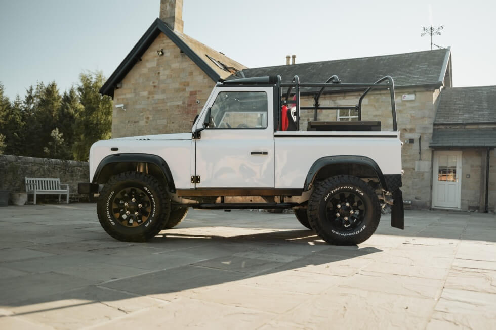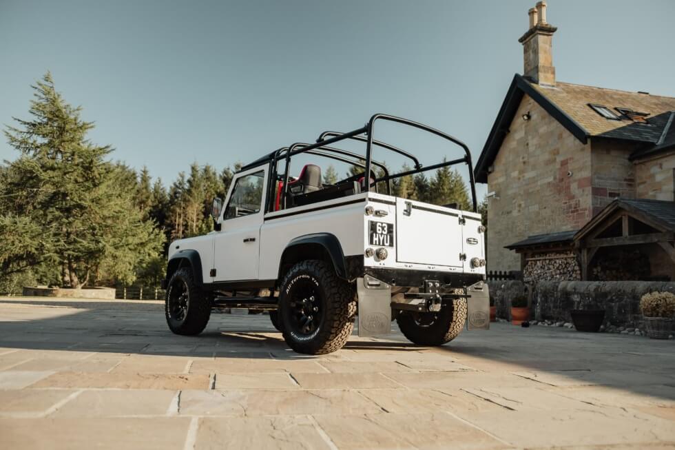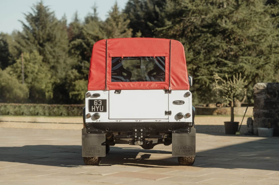 Rear seats mean you and the gang can head out on escapades. The 1999 Land Rover Defender 90 is finished in white with black trims on the flared fenders, grille, bumpers, running boards, door handles, and hinges. The removable soft top is red. It’s in a right-hand-drive setup with a 2.5 TD5 engine and a manual gearbox.