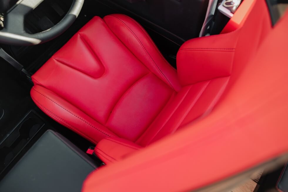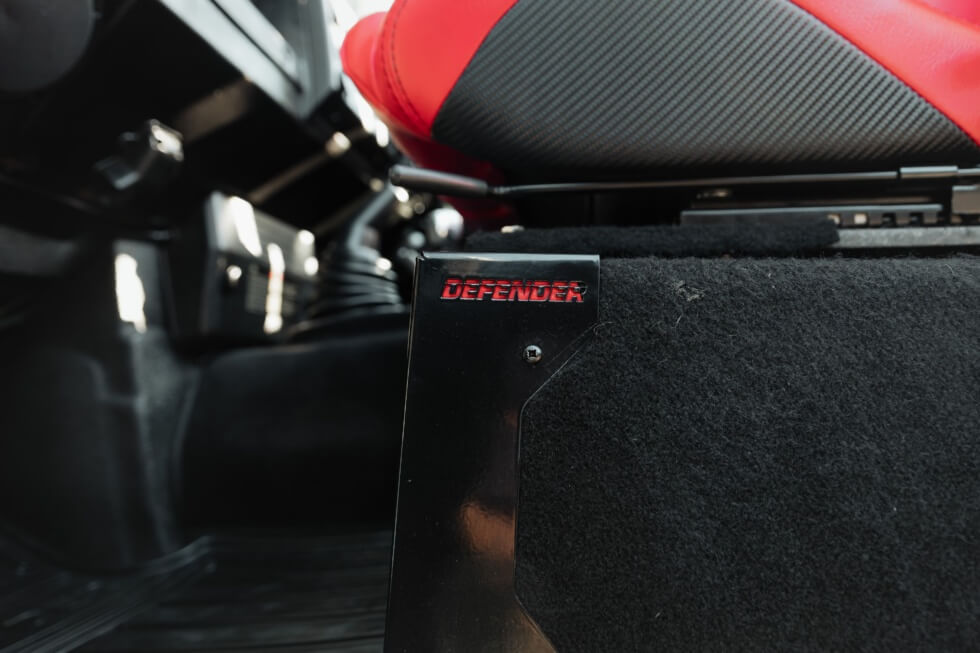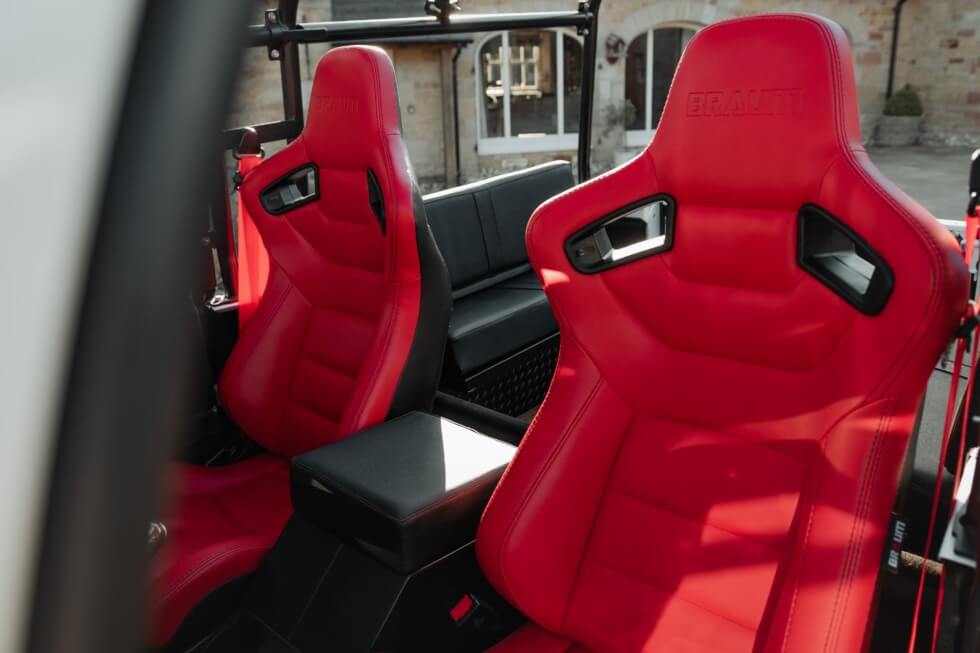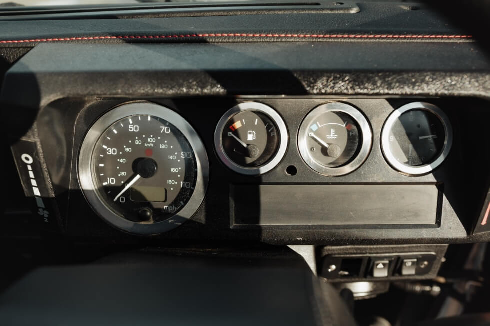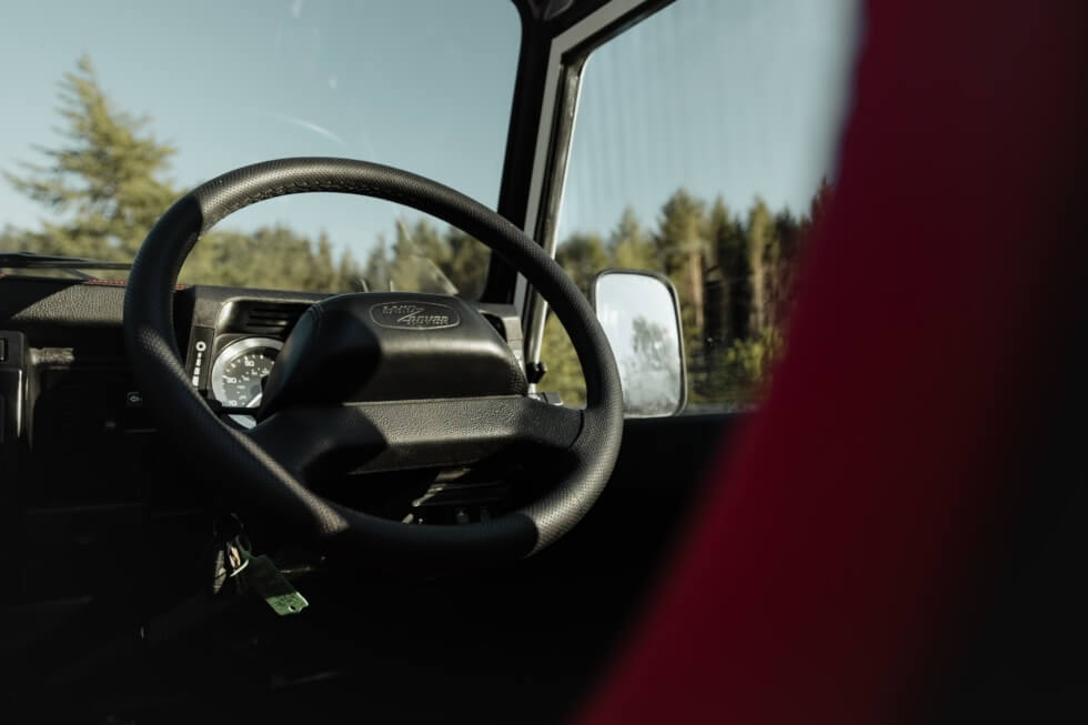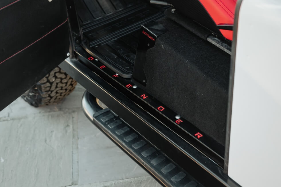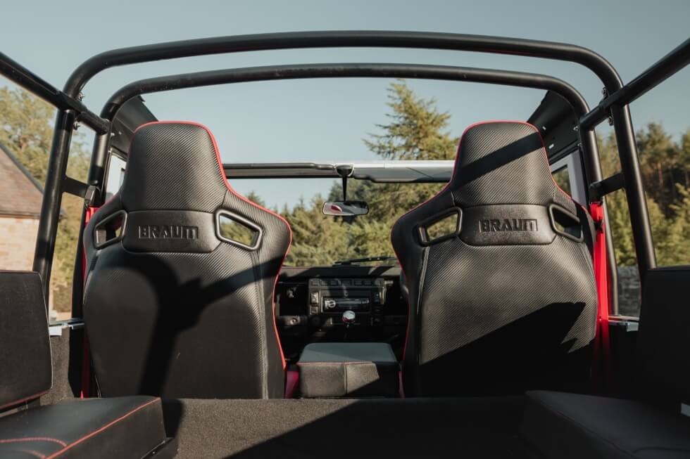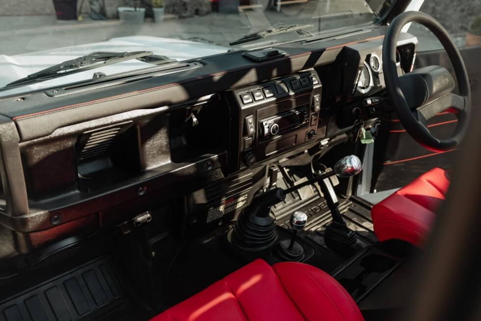 The odometer shows 65,800 miles. VIN SALLDVA87XA177018 features Braum carbon fiber seats in red leather upholstery. The rest of the cabin flaunts a mix of black and red upholstery with contrasting stitching. As of this writing, the 1999 Land Rover Defender 90 is still available.