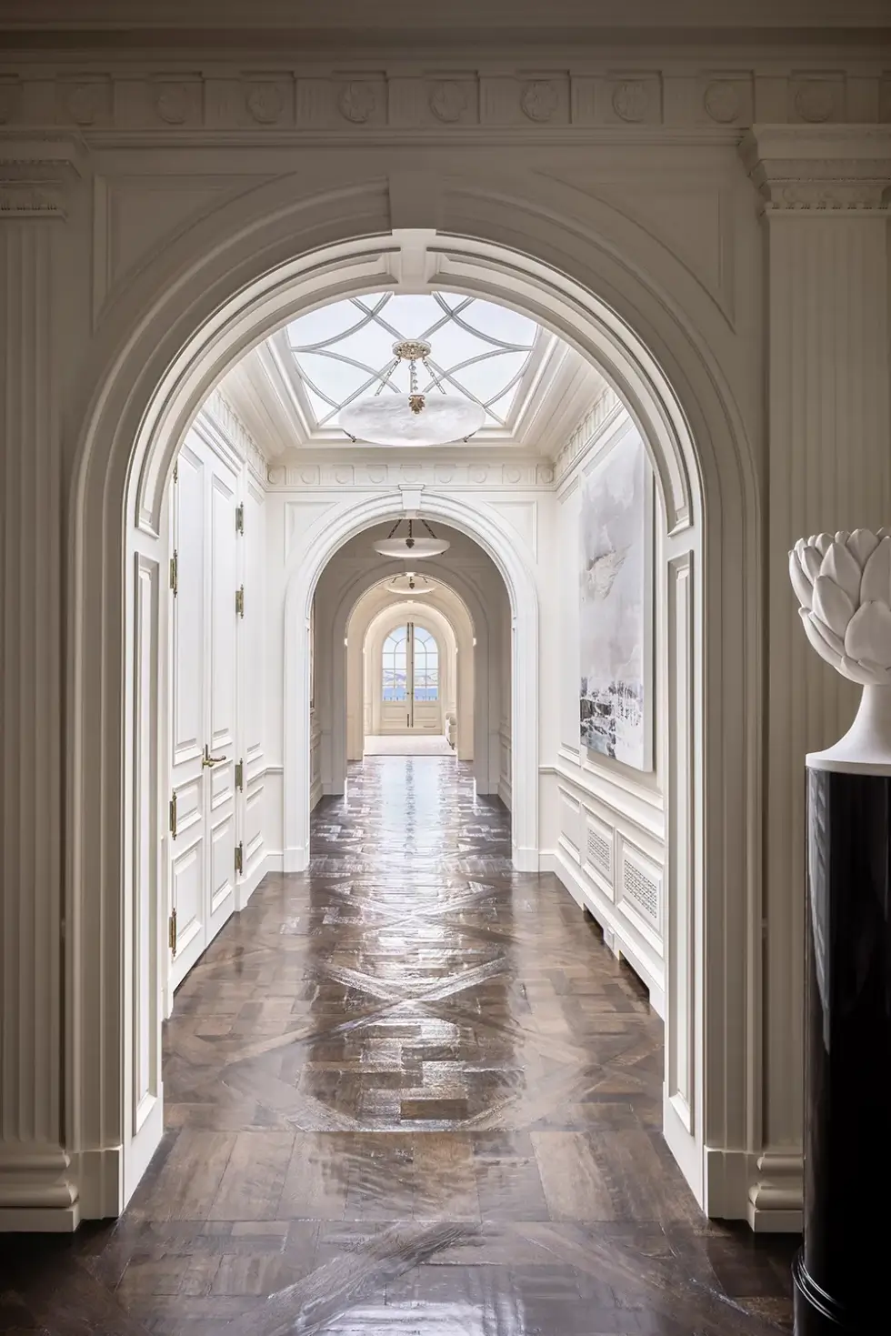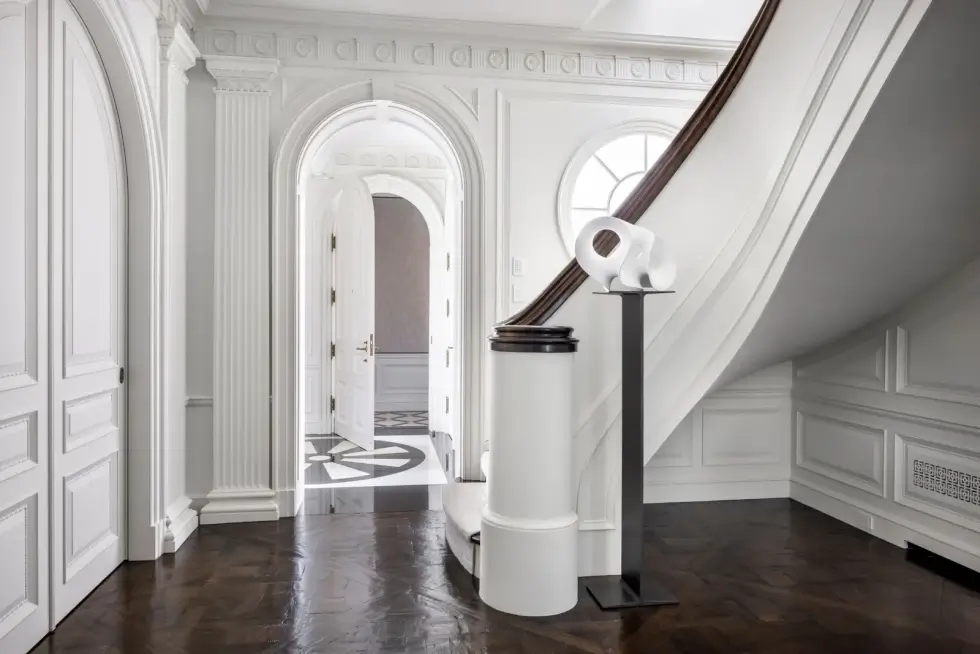 Accessed by elevator, the 2000 Washington #7 penthouse is full of period details beginning with the entry gallery and enfilade finished with decorative molding and detailed skylights. The parquet Versailles flooring is also waxed to help brighten up the space throughout the home. Contrasting the dark wood floors are the walls and ceilings which are painted white for a contemporary finish.