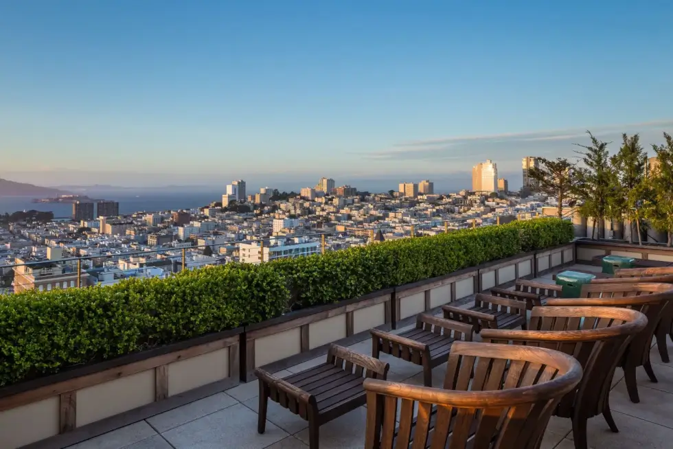 Meanwhile, high ceilings, white fluted pilasters, arches in enfilade, and rosettes pay tribute to its classical heritage yet convey a modern feeling of openness. The opulent primary suite complements three guest bedrooms, each equipped with marble baths while a sweeping curved staircase leads to the upper level of the 2000 Washington #7 penthouse which hosts the home office or media room boasting with soaring ceilings. In this area you’ll also find a wet bar and a landscaped terrace that offers spectacular views of the North Bay.