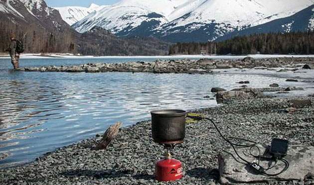 The pot can be placed over any heat source (we were thinking the camp fire or stove) and simply plug it in to your device. The charging cable is completely fireproof, while the pot is designed to deliver 5W of power in even the harshest of climates.