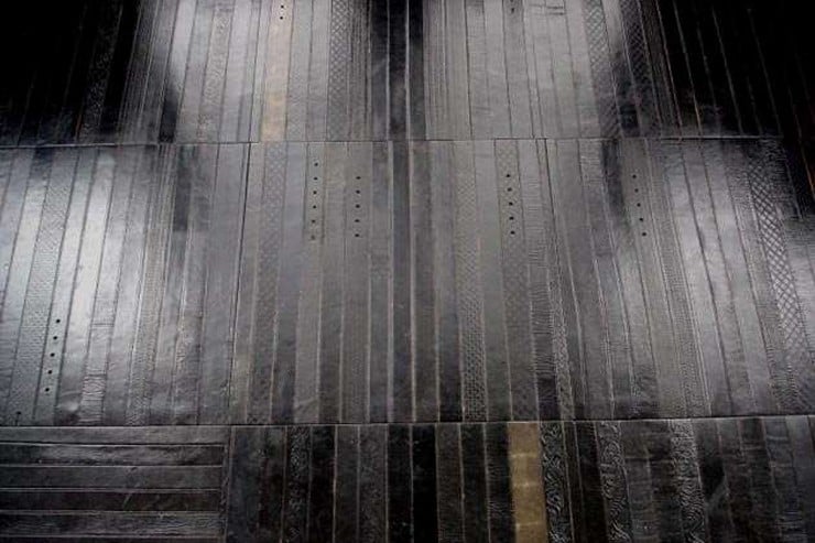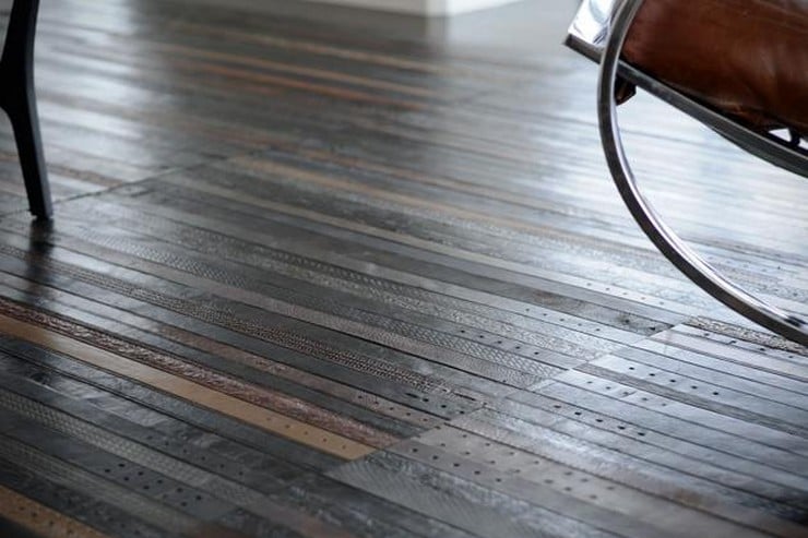 Ting architects working out of London took old leather belts, cleaned and treated them, cut them to the same size, and used a water based glue to hold them together. The result is the Recycled Leather Belt Flooring ($75 per square foot).