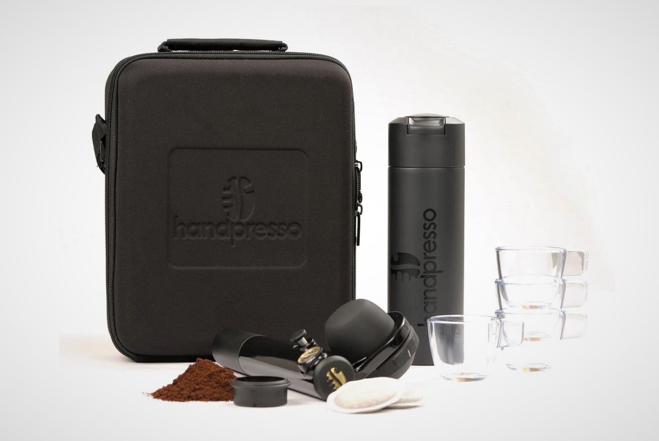 The Outdoor Espresso Set ($138) contains a portable and manual espresso machine called Handpresso that works with ground coffee or E.S.E. pods. The Kit also includes a single-hand thermos flask, 4 unbreakable cups, and a small napkin to keep it all neat.
