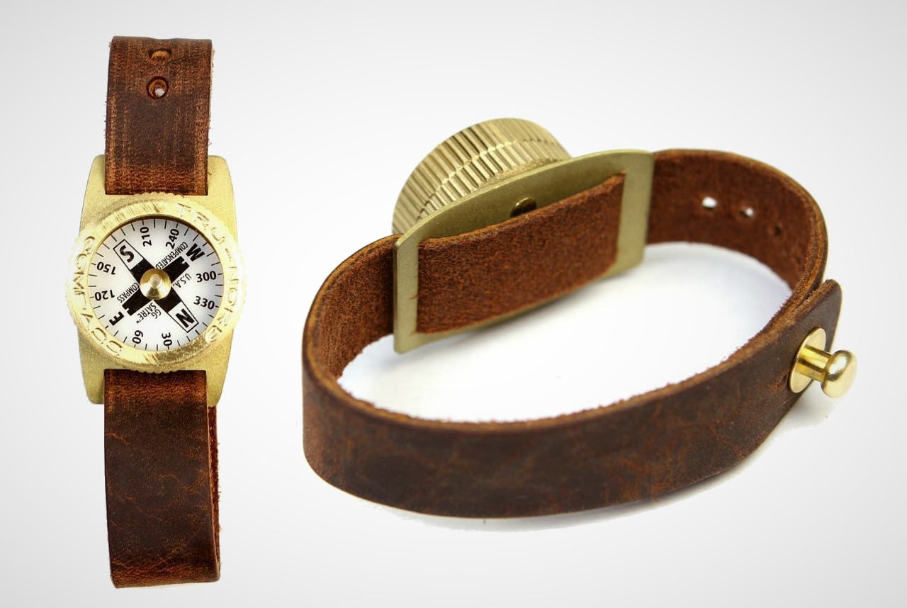 The Tru-Nord Compass ($25) has been made in Minnesota for over 66 years. Each piece is manufactured on precision CNC from a solid brass rod and features a jeweled movement that floats on a polished tapered pinnacle, covered by a Lexan lens and a cobalt steel magnet for superior stability. The brass cover ring is then threaded to the brass case for a water and shock resistant seal. It glows in the dark and comes attached to a stud leather strap.