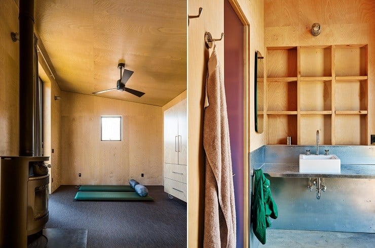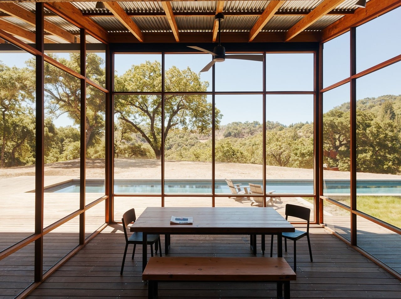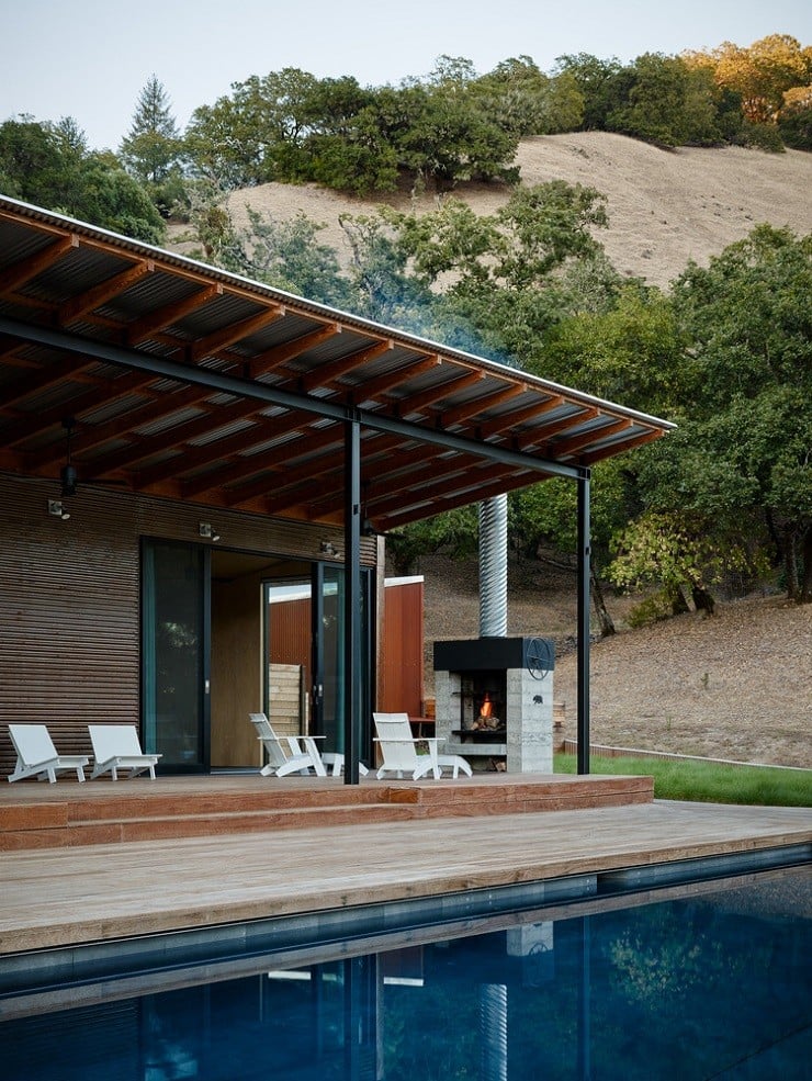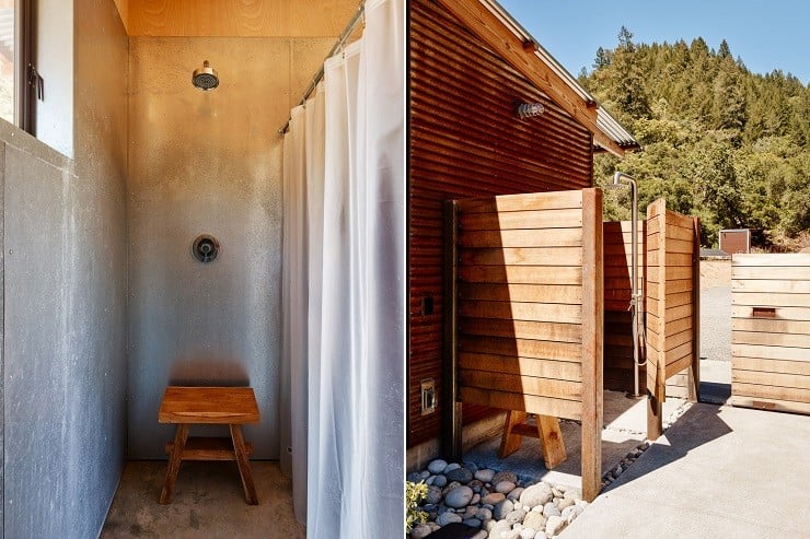 The 100% off-the-grid dwelling is set up like a permanent campsite with two main structures, one an equipment barn/garage and the primary living space. There is an 82 foot heated swimming pool out back. Other amenities include the concrete fireplace and grill and the partially screened outdoor shower. From the screened dining area to the tree-shaded parking space, Camp Baird provides a wonderful blend of outdoorsy charm with structural materials designed to minimize fire threats. The architects say they “stood back and let nature be the star.”