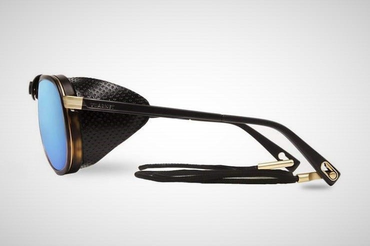 Constucted of Italian acetate and stainless steel, the frames feature a matte finish Tortoise with black temples and gold hardware.  The lenses are impact and scratch-resistant mineral glass in pure gray with blue flash, while the nose bridge and the removable glare shields are perforated black leather.  A detachable leather cord with steel fastening system, a leather carrying case, and drawstring pouch are also included with the shades.  Whether hitting the slopes or cruising the highway, the Glacier guarantees you’ll do it in style.