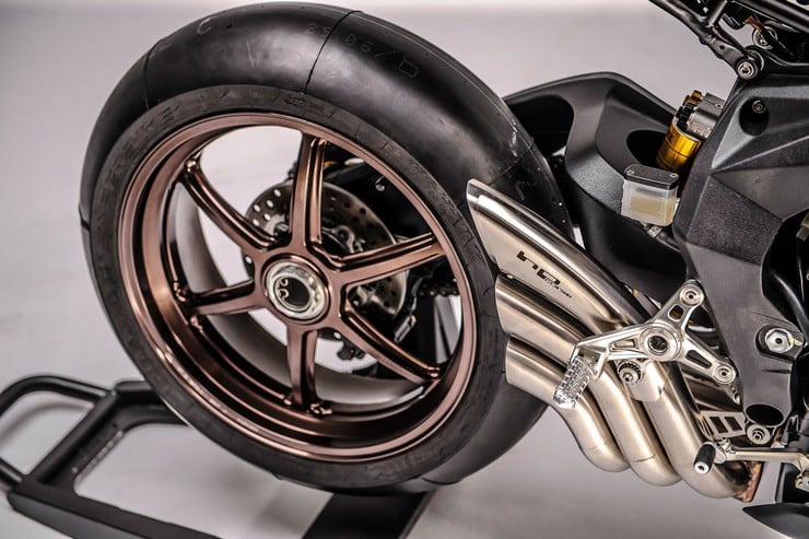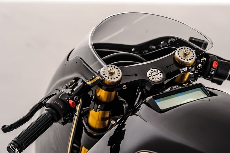 Drawing inspiration form the dustbin faired racers from the 1950s, the sleek fairing up front was specially designed so that it could turn with the forks and avoid the usual problem of restricted turns. This piece is made to be quickly removed – in case of extra side-wind issues- and a headlamp installed in mere minutes. To enhance the GP look, Winston created a set of custom 6-spoke, vintage-inspired wheels that sport Beringer brakes with cast iron rotors , while the sleek exhaust has been provided by Hp Corse.
