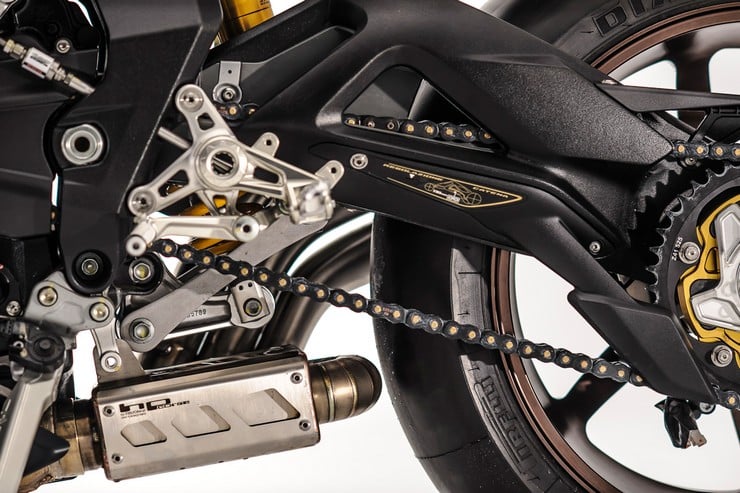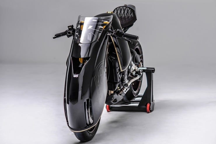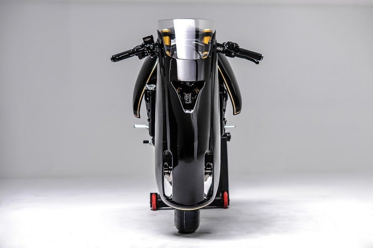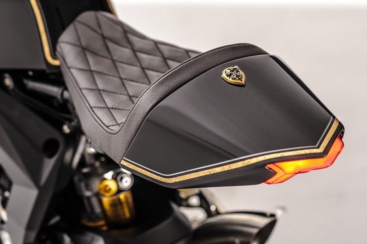 Other top-notch components include an Öhlins fork & shock, Wukawa Industry bronze wheels, Pirelli Diablo race slicks, Motogadget’s LEDs & grips, and a custom tailpiece with a diamond stitched saddle. Finally, the mechanical sculpture is finished in black paint & carbon fiber with gold anodized details. Love it or hate it, the ‘Ballistic Trident’ clearly makes a bold statement! [via]