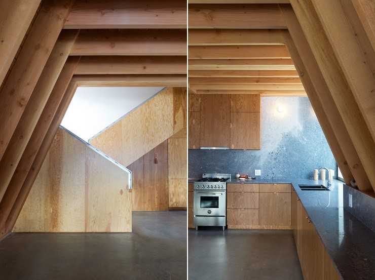 Anchored firmly into the bedrock, the rough sawn lumber frames a steep-sided A-frame cabin home. Able to shrug off the winter snows, the two-story structure offers a warm haven. While the living room/kitchen areas face the scenic mountains over Green Lake, the upper-level bedroom accesses a private terrace built into the bluff behind the house.
