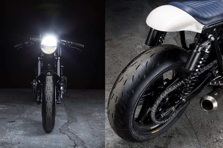 This example of Triumph cafe racer art is expressed by the flowing racing lines it boasts.  The lightweight carbon fiber wheels inspired the name ‘Zero Gravity’ as the handling is very light. Aesthetically, the thinner custom tank takes the place of the bulbous factory issue one for a much more streamlined look. Other customizations include by the replacement of the fuel injection with Keihin CR35 carbs, a trimmed subframe, a handcrafted tail section with leather seat, Arrow exhaust headers, Spark muffler, Michelin Power Cup Evo tires, Bitubo rear shocks, front forks from a Triumph Daytona 675, dual-disc Beringer brakes, and a sleek carbon fiber front mudguard.