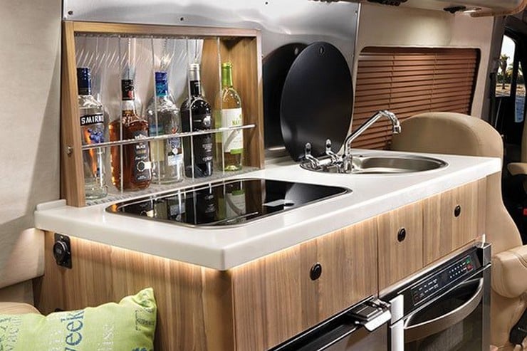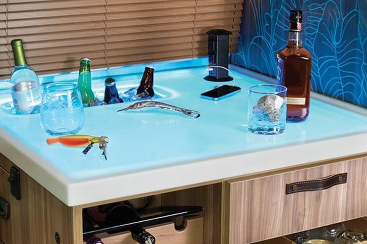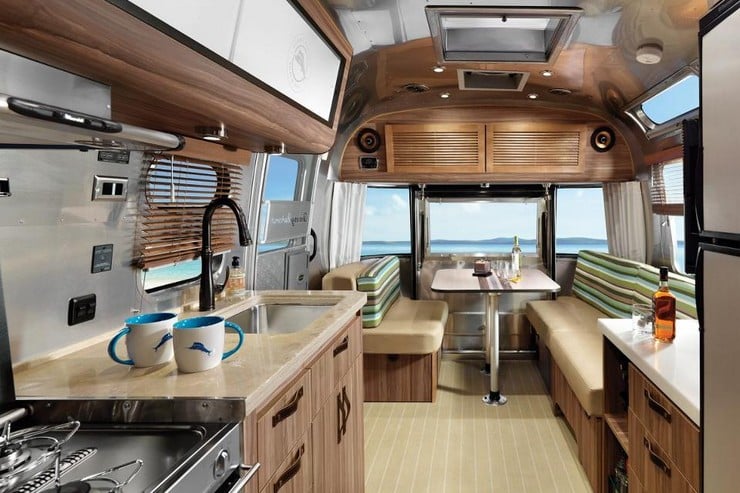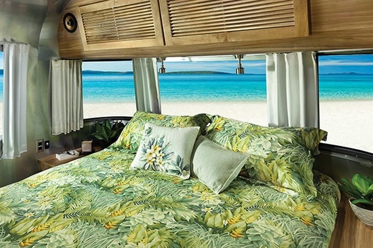 Made to sleep up to four people, the 28 foot Airstream Interstate coach has been decorated and accessorized with Tommy Bahama bedding, prints, fabrics, and even a built-in bar designed to hold exclusive old-fashioned and stemless wine glasses.