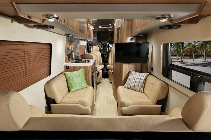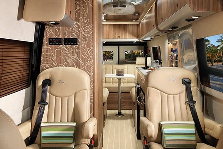 The Touring Coach is built on a Mercedes-Benz 3500 Sprinter chassis and comes in two floor plans that carry between six and nine people. It is powered by the Mercedes 3.0-liter turbo Diesel V6 engine that promises its 325 ft-lbs of torque will help the 188 horsepower engine pull your Tommy Bahama Airstream trailer anywhere you want your adventure to take you – parrots not included.