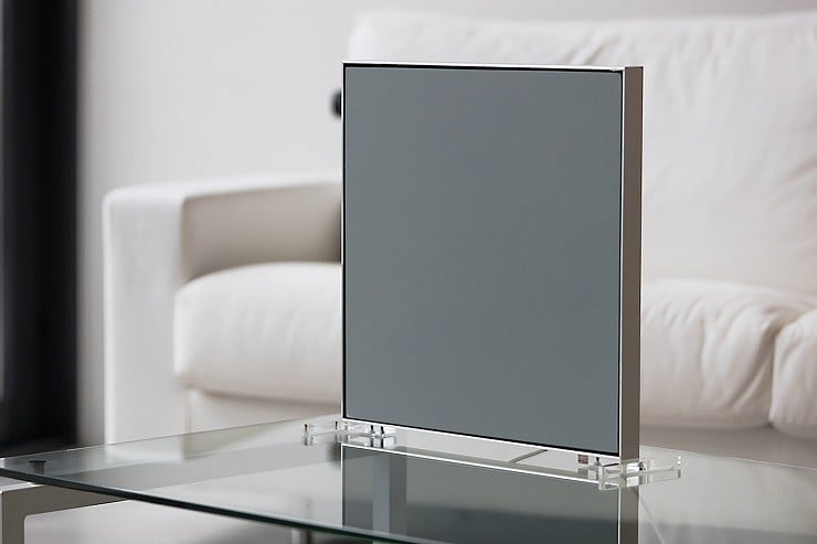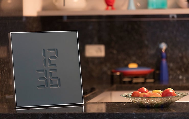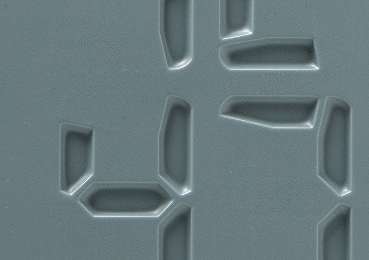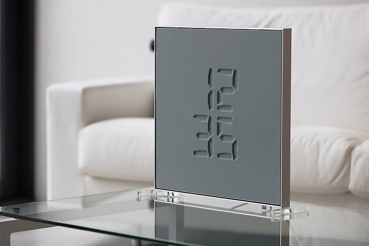 The ETCH is 15 3/4″ square and can be hung on either a wall or, by screwing on the base, can sit on the desk or mantle. Inside the elegantly understated aluminum frame, the face of the ETCH is covered with a Dark Peacock colored elastomer surface. Each thirty seconds the clock will create a digital time display within that surface, not with light but through a process that actually sinks etched-looking 3-D numerals into the elastic surface.