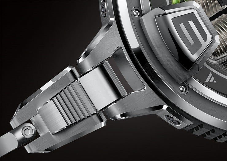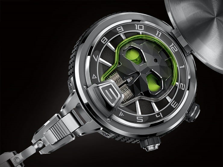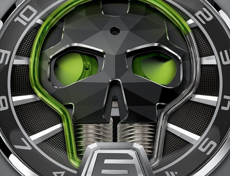 This heady watch forgoes mere hands to tell the time.  Instead it boasts a skull centerpiece surrounded by a fine capillary containing a green fluid that’s slowly pushed through to indicate the luminous numbers on the outer bezel.  The eyes also glow with the same eerie green color, while a push-piece flashes two blue LED’s across the skull for added spooky effect.