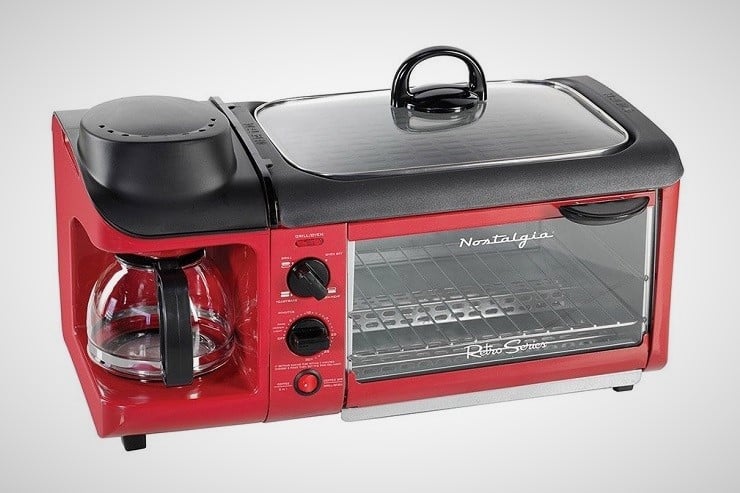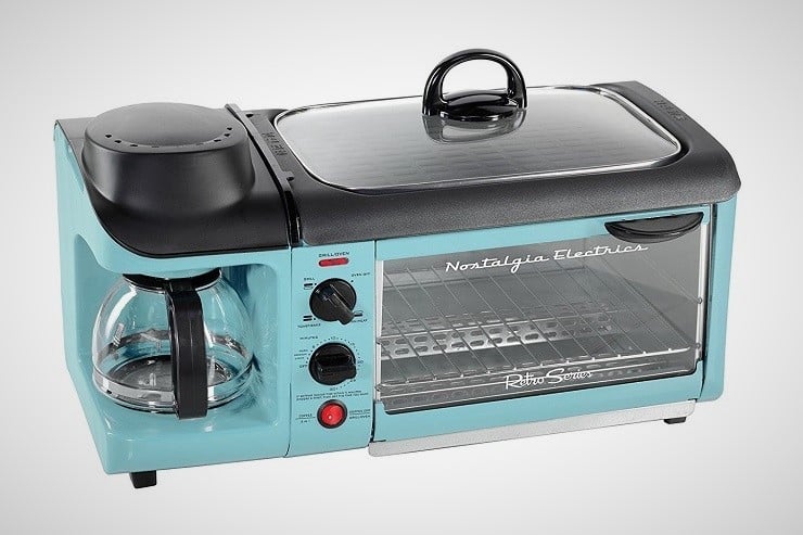 The Nostalgia BSET300 Retro Series 3-in-1 Family Size Breakfast Station ($70) combines a four cup coffee maker with a toaster oven capable of holding four pieces of bread at a time and a topside grill for cooking bacon and sausage or eggs all at once.  At just under 20 inches long by a foot tall and deep, this 13 pound machine if a perfect fit for campers or tiny houses.  It uses standard 120 Volt, 1,500 Watt power and is controlled from two simple knobs on the front.