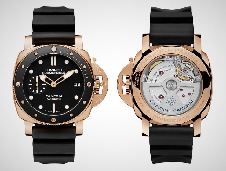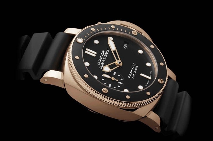 Slightly smaller than the average Panerai Submersible is the second release, the Oro Rosso, which has a 42mm case in rose gold, accented with a black ceramic clockwise rotating bezel. The Oro Rosso is water resistant down to 100 meters and comes with a black Caoutchouc strap.