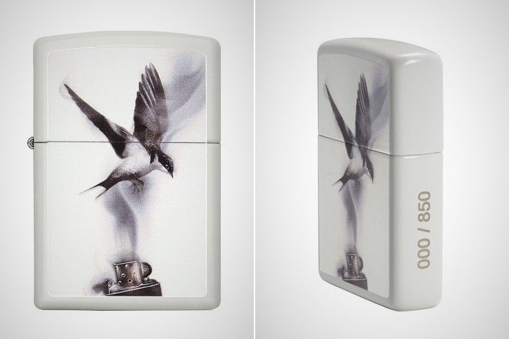 The depicted swallow is seen rising from the swirling clouds of inspiration from a Zippo lighter below to signify the artist’s creative spark. Limited to only 850 lighters distributed worldwide, the drawing is reproduced using the color image imprint method on a white matte finish.