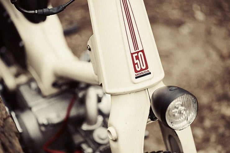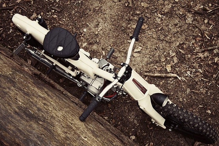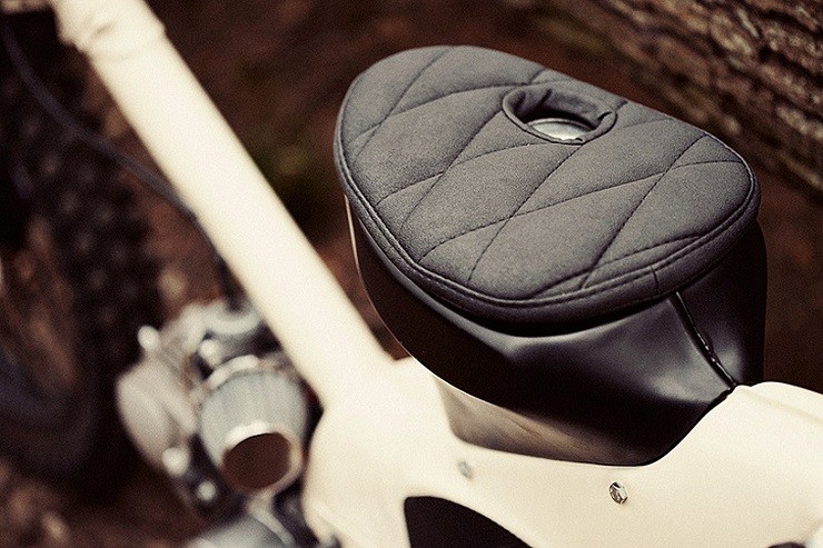 Built by Paris-based custom motorcycle workshop 56 Motorcycles, this nimble machine begun life as a 1970’s 50cc Super Cub.   The French lads began the build by stripping away all but the bare necessities.  This included the fences, saddle, headlights, speedometer, and even the original brakes.  The carburetor was replaced by Keihin and was attached with an air filter, the engine was cleaned and recoated in gloss while the body of the moped was covered in classic white.