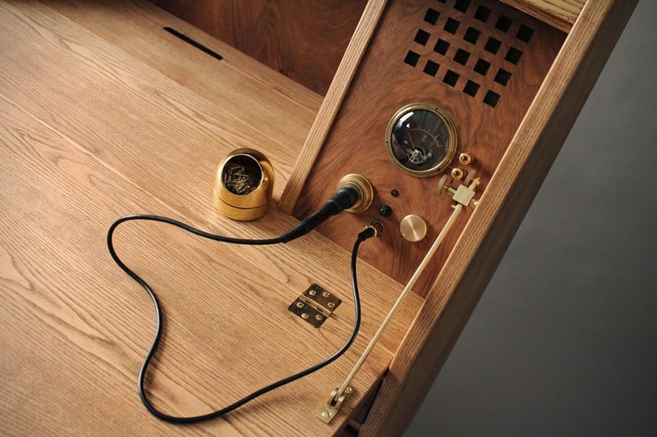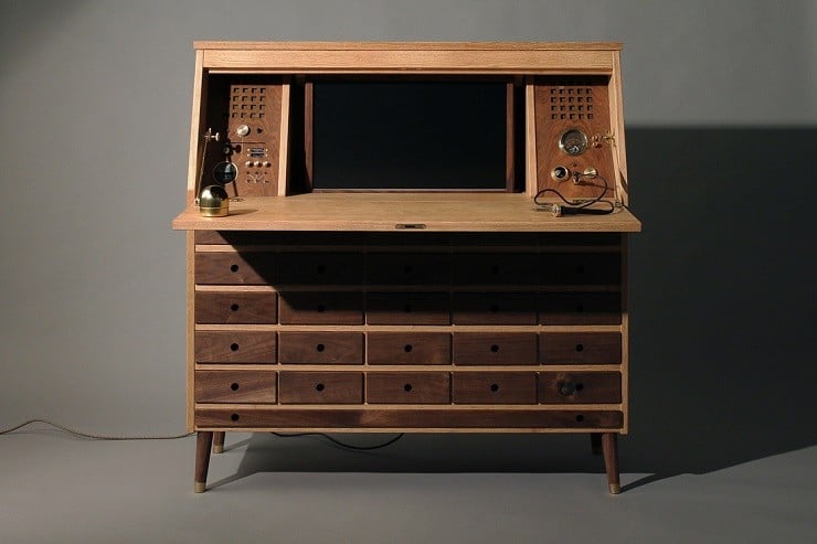 The interior of the work area is also set up to be fully integrated with electronic equipment, as well as a built-in computer with motor driven 24″ pop-up monitor and a soldering station. While the concept model shown was specifically set up for the builder’s personal needs, the “Tempel” is a modular unit which lends itself easily to customization for a wide variety of endeavors.