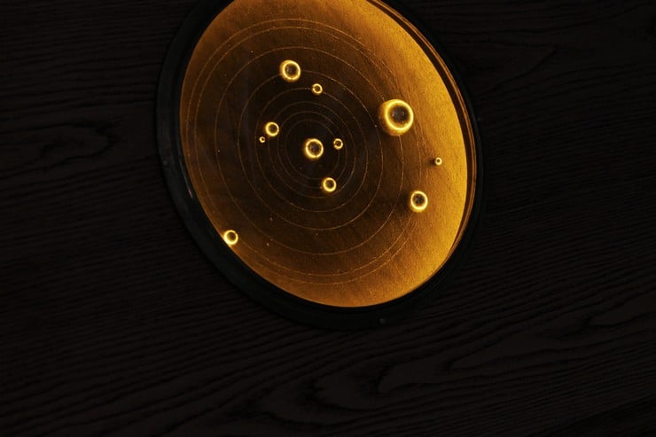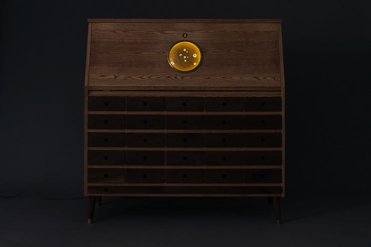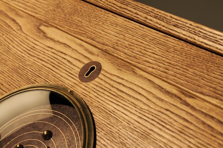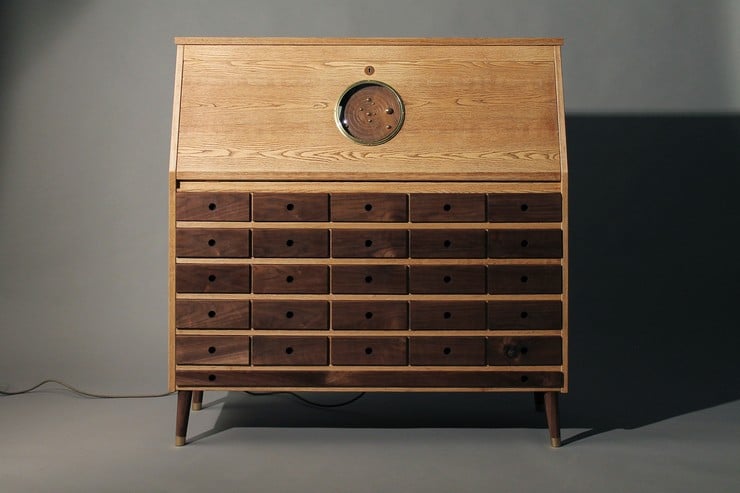 The Tempel Workbench ($Inquire) is a satisfactory 43″ x 43″ x 16″ and its front half folds up like an old-world writing desk when not in use. The decorative locking mechanism portrays a planetarium of our solar system. Below the workbench of the “Tempel” are 26 storage drawers for your work, while the back of the workbench provides space for hanging tools.
