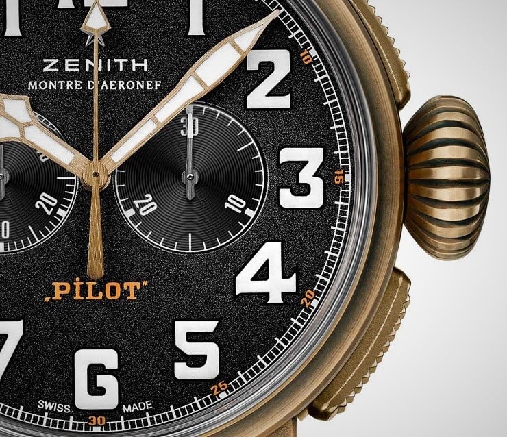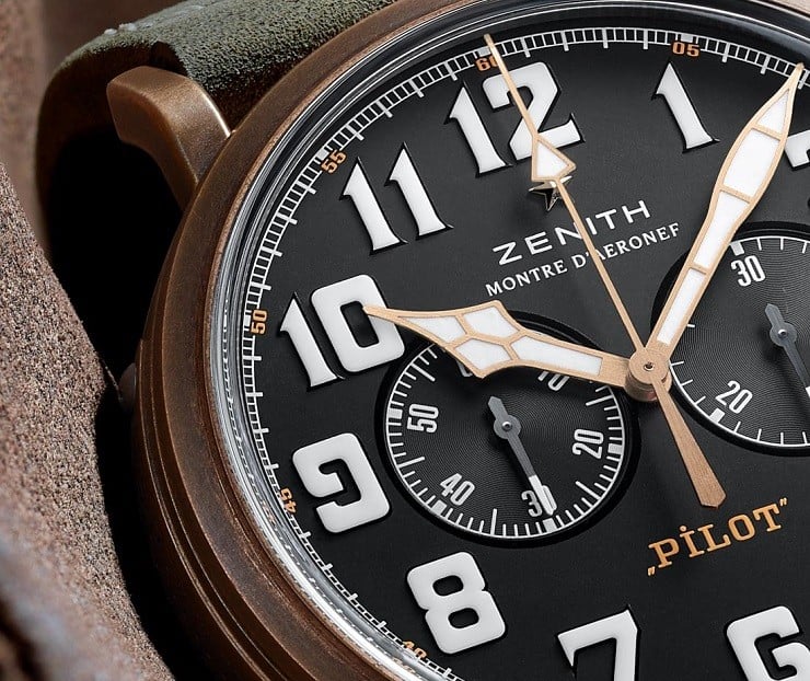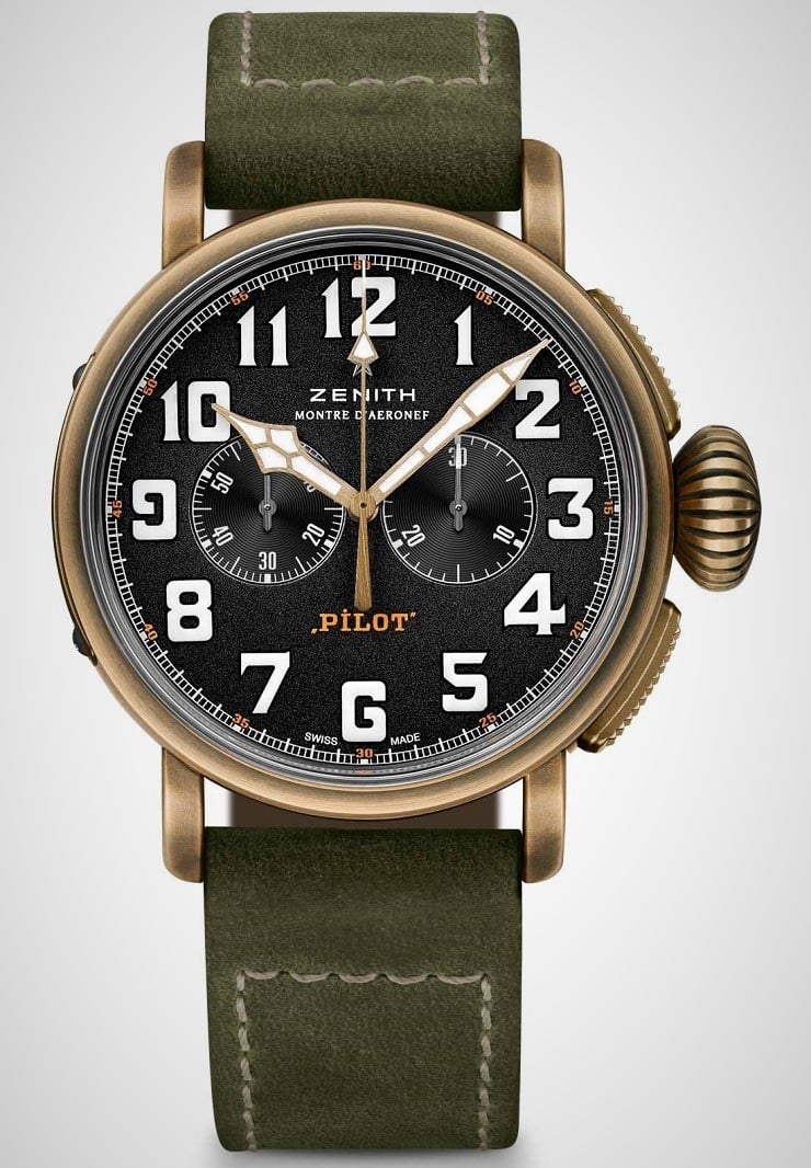 Zenith is so serious about their aviation-style watches that the company had trademarked the word “Pilot” so only their watches could be designated as Pilots on the faceplate.  Now they have added to their line the Zenith Heritage Pilot Extra Special Chronograph ($7,100), using bronze as case material.