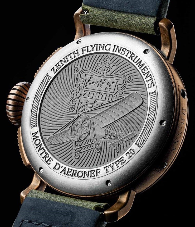 The timepiece is somewhat large, clocking in at 45mm wide with a 14.25mm thickness, and comes with an oiled green nubuck leather strap with rubber lining.  The face features extra large Super-LumiNova C1 Arabic numerals and wide, shaped gold-plate hands, while the back of the case is pure titanium decorated with the Zenith Flying Instruments logo.  The domed sapphire crystal has an anti-reflective coating on both sides for extra visibility.
