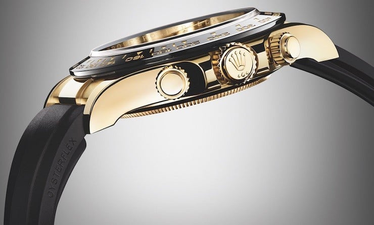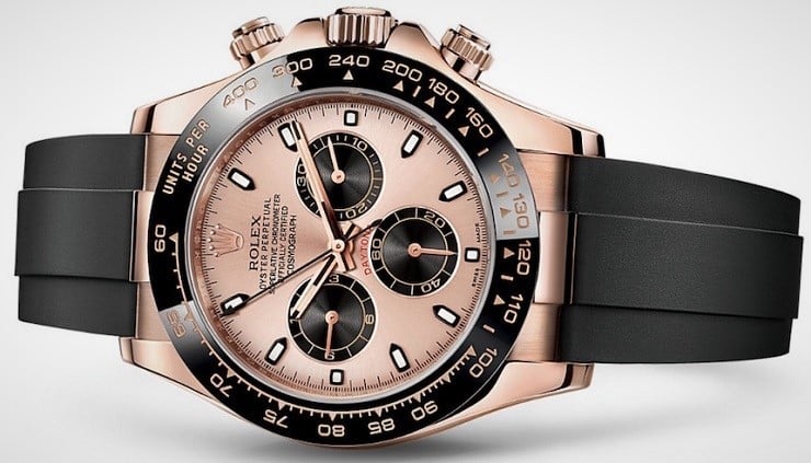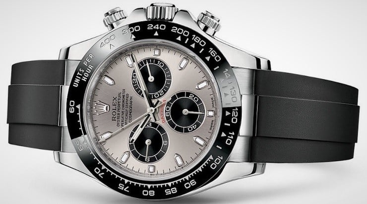 Sporting a high-tech ceramic bezel in 18-karat white, yellow or Everose gold with an Oysterflex rubber strap (elastomer reinforced with a metal blade), the just launched 2017 Rolex Cosmograph Daytona ($27,500+) gets a refreshed look that is sure to spark contrasting opinions among the Rolex fans.