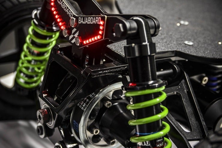 With an aluminum independent double-wishbone suspension system and aircraft grade aluminum backbone over a maplewood deck, the Bajaboard G4 uses four adjustable 60mm travel shocks to smooth the ride, while the 10″ pneumatic tires can cruise you over rocks and gravel as big as tennis balls. The G4 has four 63mm brushless DC high torque motors, two on each end, with a 4:1 ratio belt drive transmission, and a wireless hand controller.