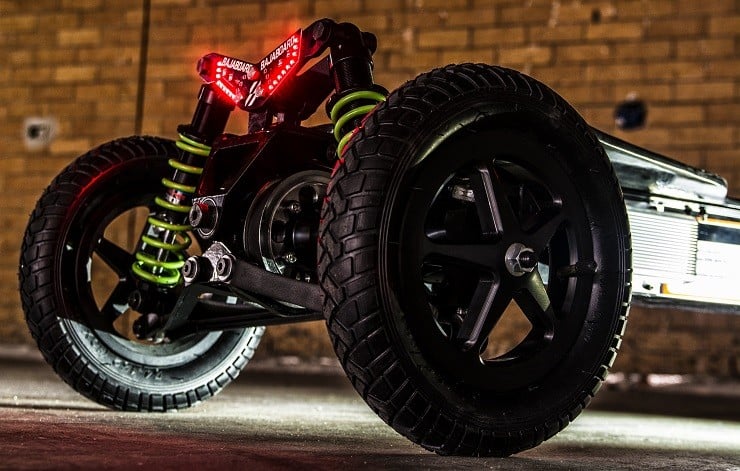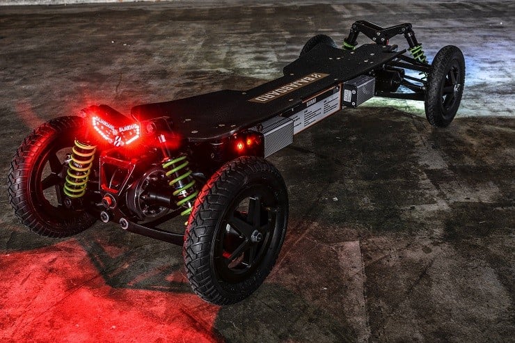 With a top speed of 31 mph and an 18-22 mile range, the board can still climb a 30-degree grade with a maximum 200-pound load. Other advantages include the ability to turn two of the motors off and use it as a drive board for up to a 15% greater range. The Bajaboard G4 lets you scoff at the types of rough terrain that formerly left you stuck on a street or trail.
