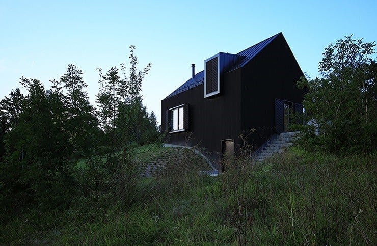 Sitting on the concrete foundation, the exterior walls of this country house are constructed of 1-foot thick concrete blocks which require no further insulation for winter or summer. The blocks are covered with a facade of Siberian Larch cladding which has been coated with two layers of all-natural black wood tar for weatherproofing protection.