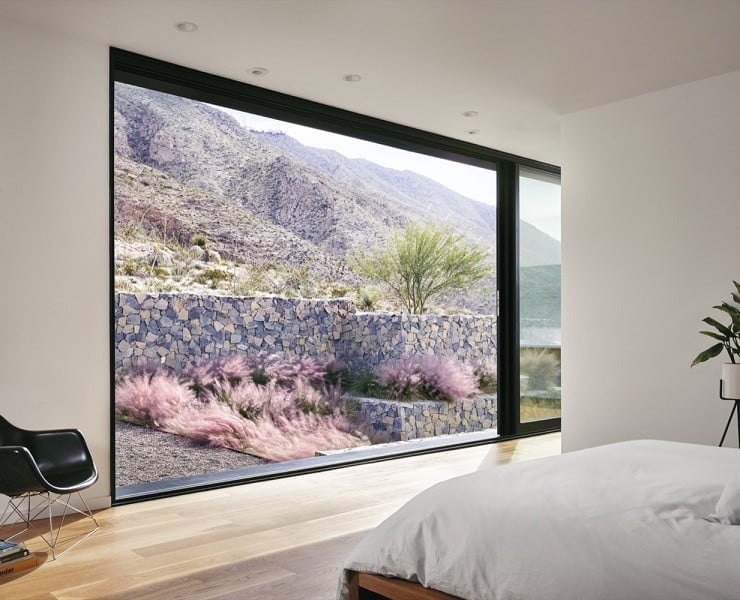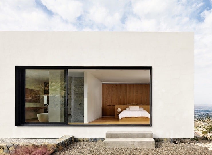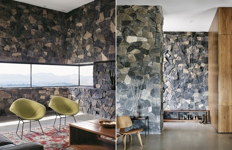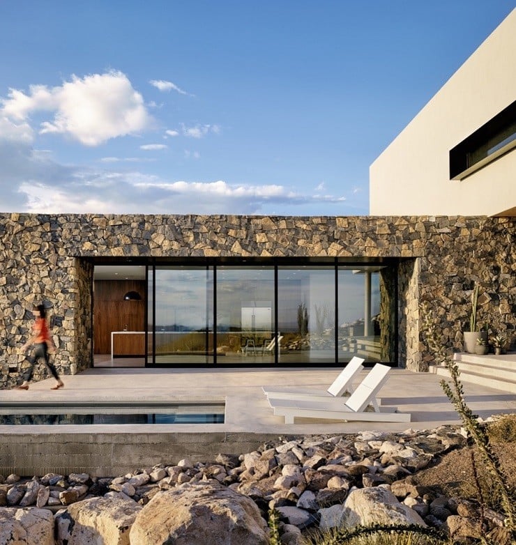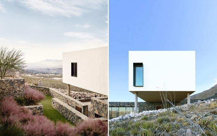 Utilizing natural materials including local basalt grey stone, white lime stucco, and steel & leather recalling the city’s cowboy history, the 5200 ft2 family home is surrounded by a small ecosystem of cacti, aromatic herbs, and multicolored grasses.  Thanks to large panoramic glazing, the 3-story dwelling keeps a close connection to the exterior from every space, and boasts various terraces that catch the flow of water.  The rubble style walls of the lower floors seem to emerge from the raw nature, while the contrasting white bedroom volume appears to float above the landscape.