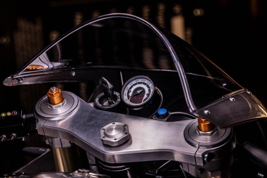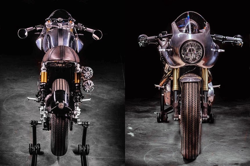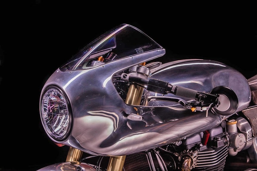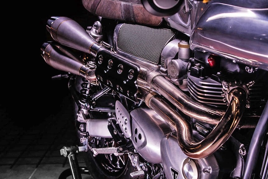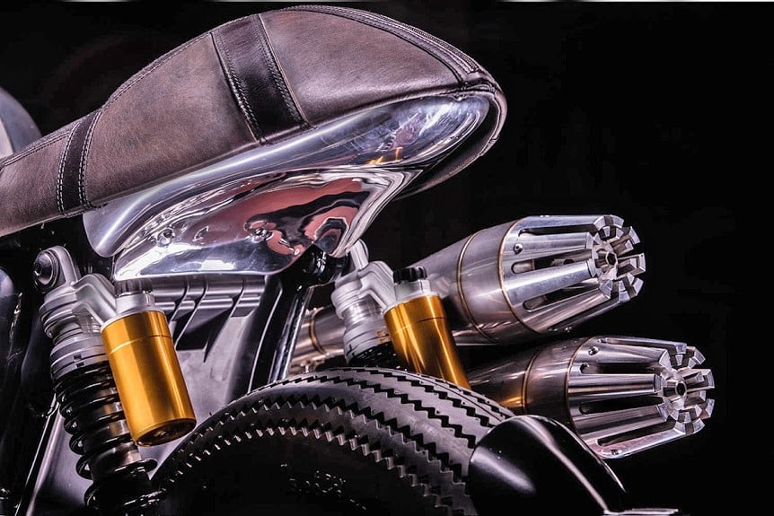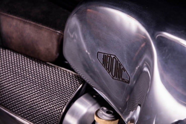 A high-mount stainless steel exhaust system helps the 1,200cc twin engine to push beyond the bike’s original 97 horsepower capability.  The cockpit has been simplified with the inclusion of a single Motogadget gauge, ignition barrel, and starter button.  The new Hedonic Thruxton R is more than just a showcase piece, it’s completely European street legal and ready to take on challengers.
