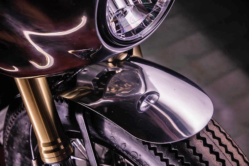 Naming this recreated bike ‘Amazing #000,’ Heitz and company spent over one hundred fifty hours just on metal shaping alone.  Not only did this include the fuel tank but the half-farings, fender, seat and belly pans, and side covers.  Formed to compliment the bike’s normal lines, these aluminum constructs have been polished and then left in the raw to showcase the work.